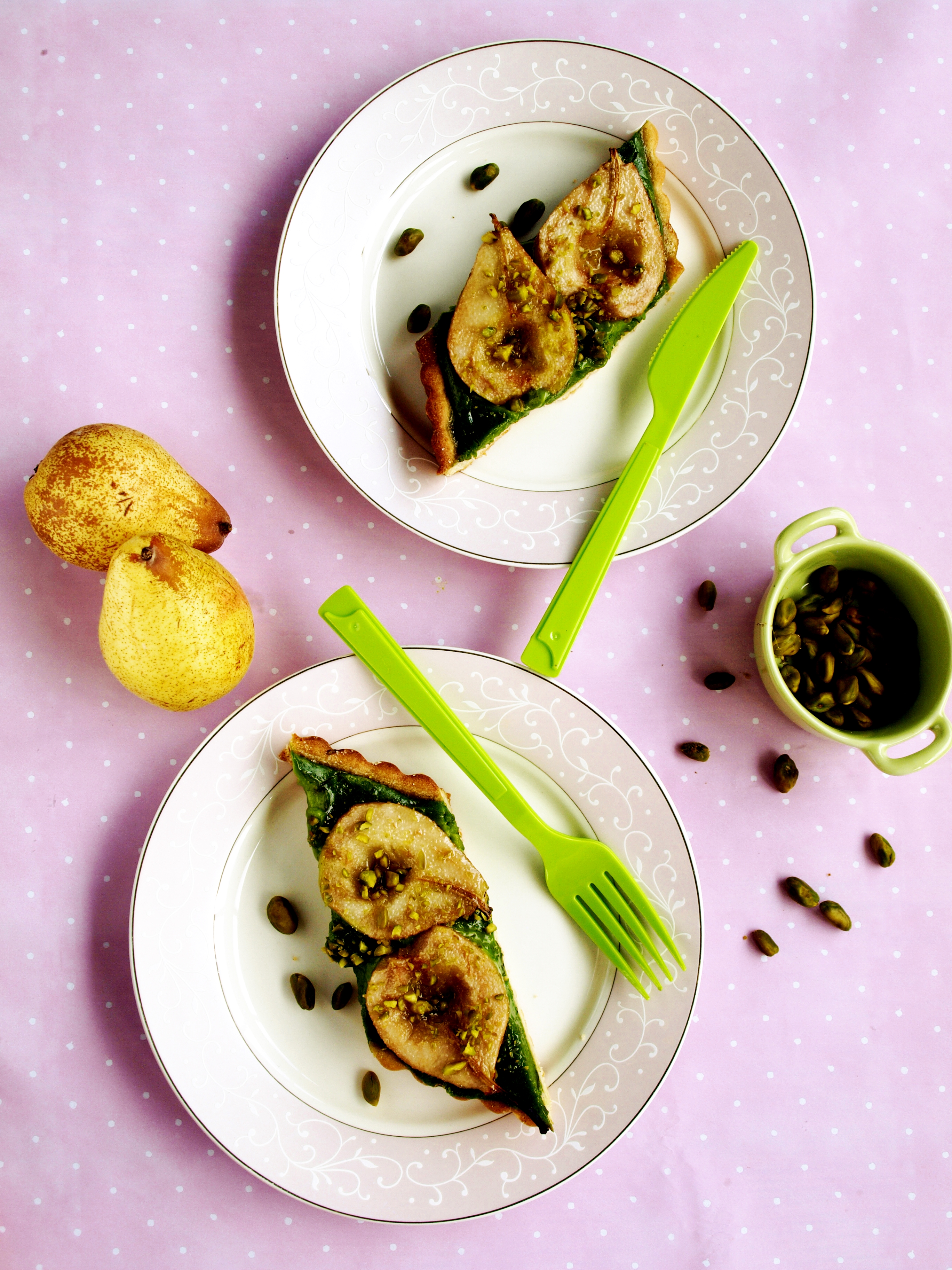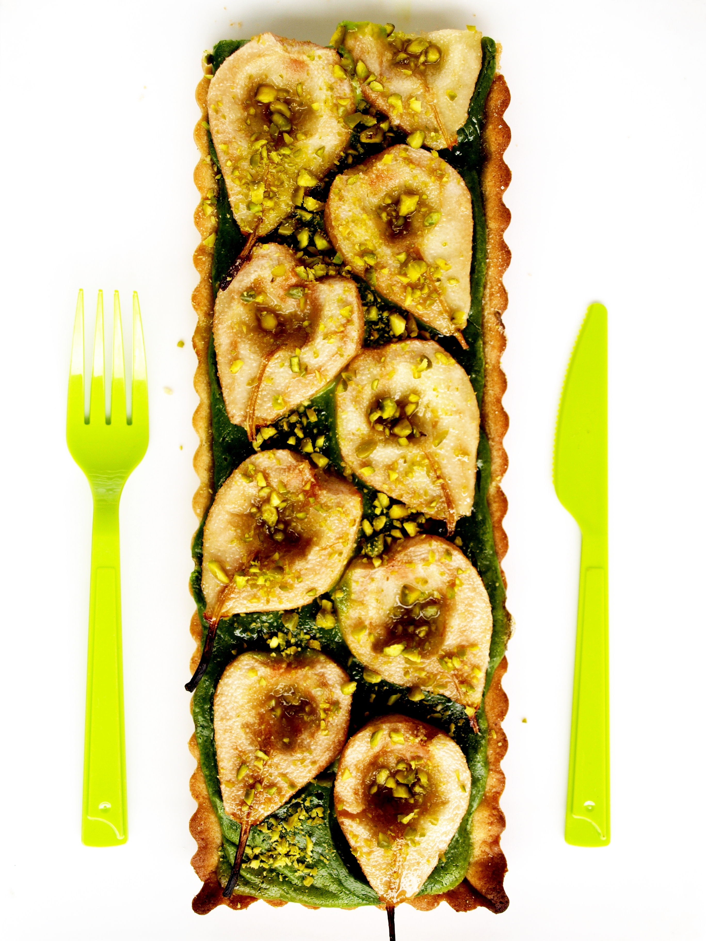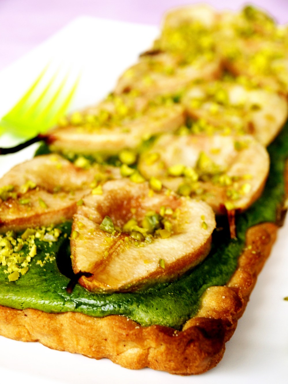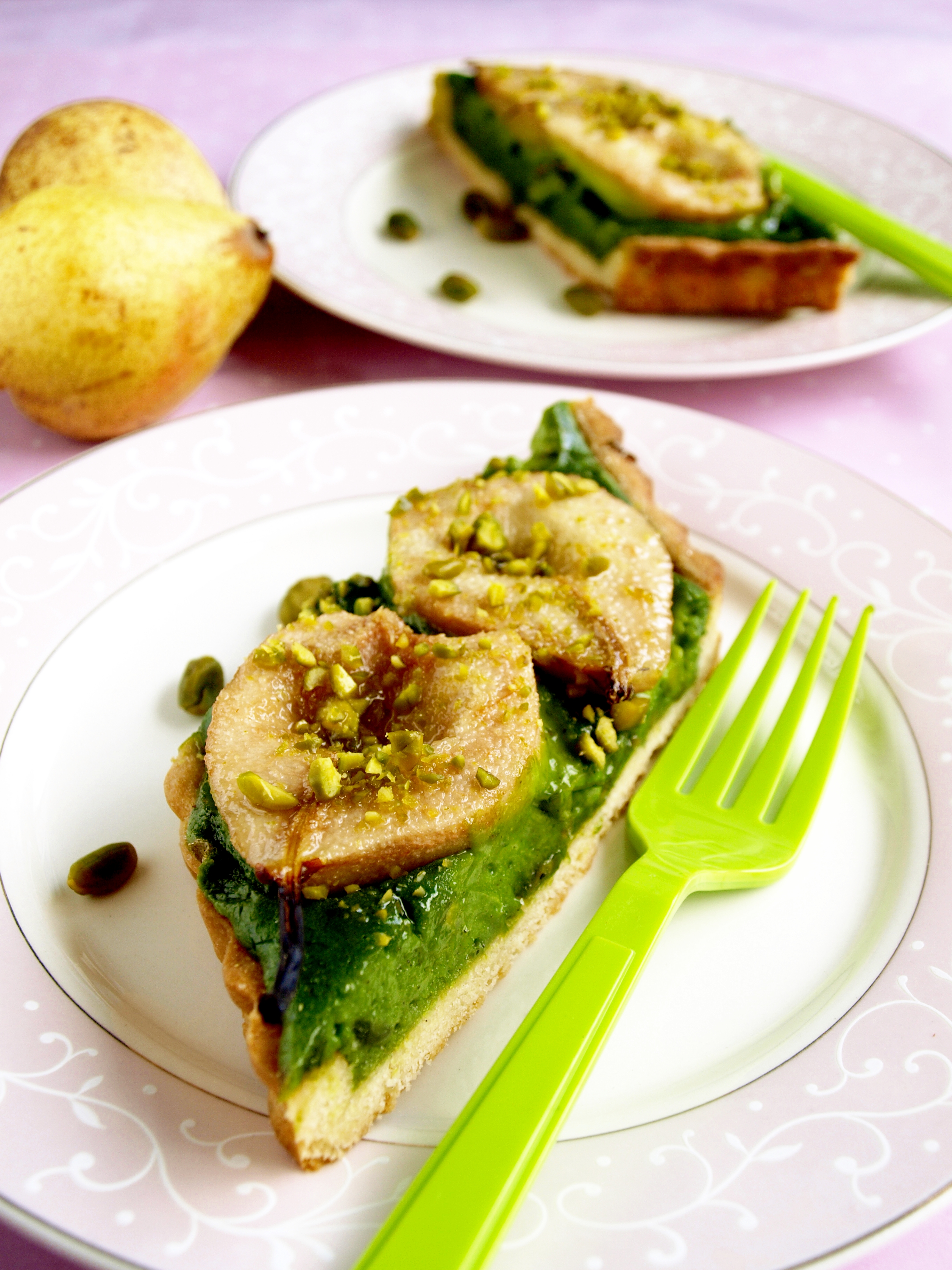 Lần này chọn làm tart lê vì mình vốn rất thích lê khi được nướng chín, cảm giác dường như miếng lê ngọt đậm đà hơn, thơm hơn và lại mềm như tan ra trong miệng. Vị pistachio vẫn là vị yêu thích của mình, thêm vào đó là màu xanh mướt của pistachio luôn nổi bật với các màu khác như màu vàng của bánh hay màu đỏ, cam của các loại hoa quả mùa hè, thế nên bánh tart lần này mình enjoy nhất có lẽ chính là phần kem pistachio! ^.^ Không biết ở Việt Nam có bán không, nhưng nếu bạn nào ở nước ngoài có thể tìm mua được “pâte de pistache”, là 1 dạng kem sền sệt gồm pistachio nghiền mịn và 1 số hương liệu khác để cho vào thì sẽ rất ngon, và rất tiện nữa. Mua “pâte de pistache” thường chỉ mua được ở những cửa hàng chuyên bán đồ làm bánh cho dân chuyên nghiệp nên phải mua với số lượng lớn, ít nhất là cũng phải 1kg, mà mỗi lần dùng chỉ hết 1,2 thìa súp thôi, hơn nữa giá cả cũng không rẻ chút nào. Mình mua 1 hộp từ rất lâu rồi, dùng mãi vẫn chưa hết, nên khi nào tiêu thụ hết hộp này, mình sẽ thử tự làm “pâte de pistache” và post công thức lên để mọi người cùng thử. Còn hiện giờ, mọi người hãy thay tạm bằng 1 lượng pistachio tương đương xay nhỏ với chút đường bột nhé! 🙂