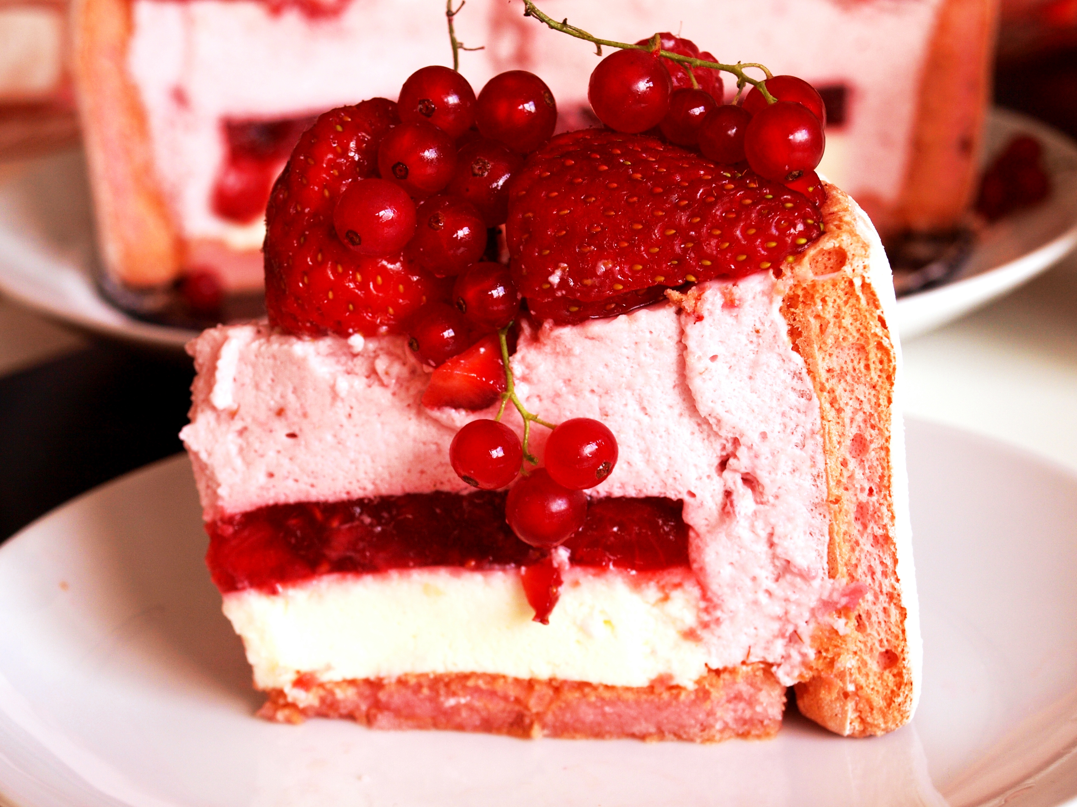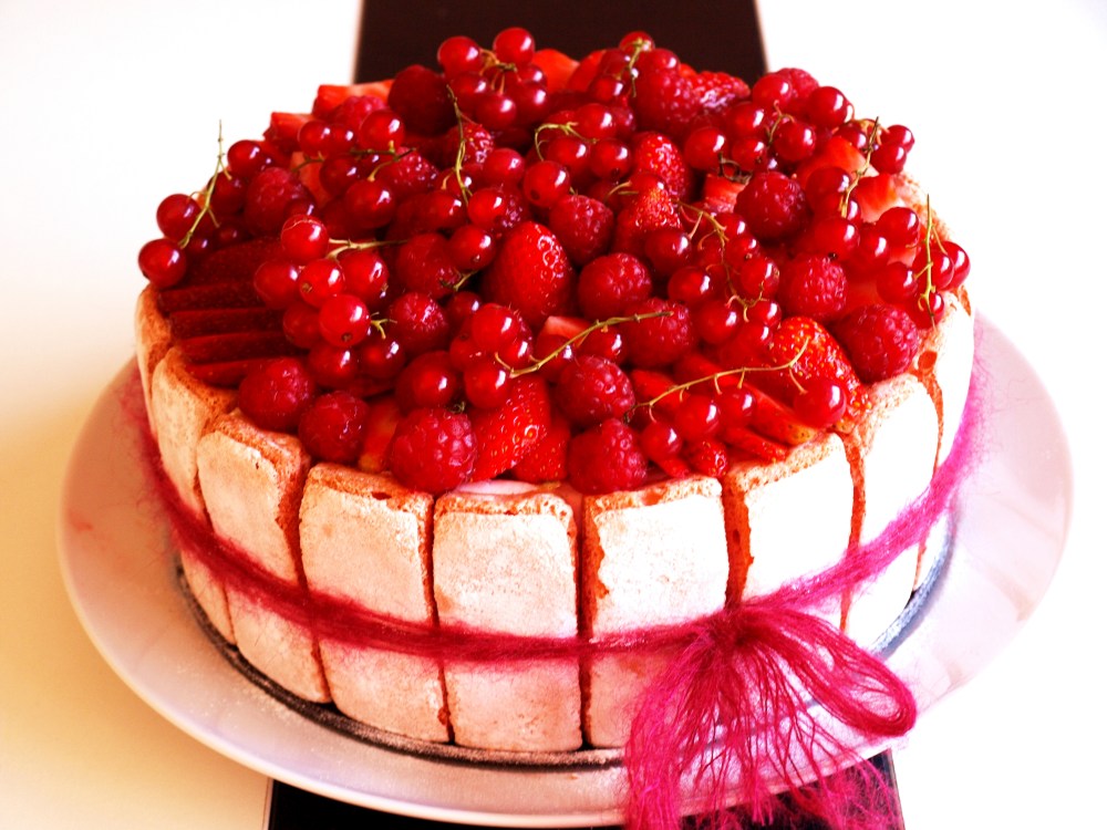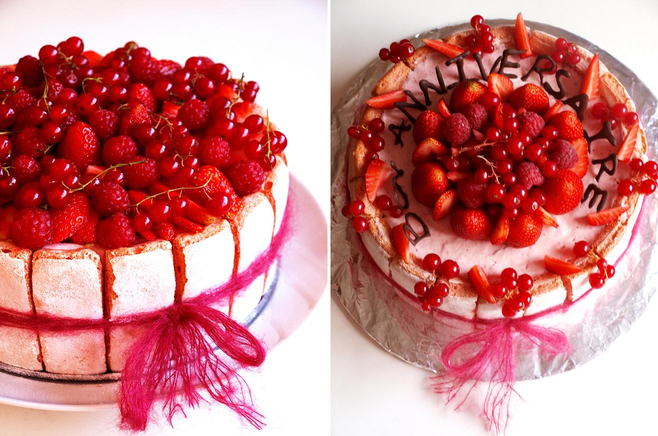 Mặt bánh được xếp thêm thật nhiều hoa quả đỏ vì nhà mình rất thích ăn hoa quả kèm với bánh. Bên cạnh là bánh làm cho sinh nhật của một người bạn.
