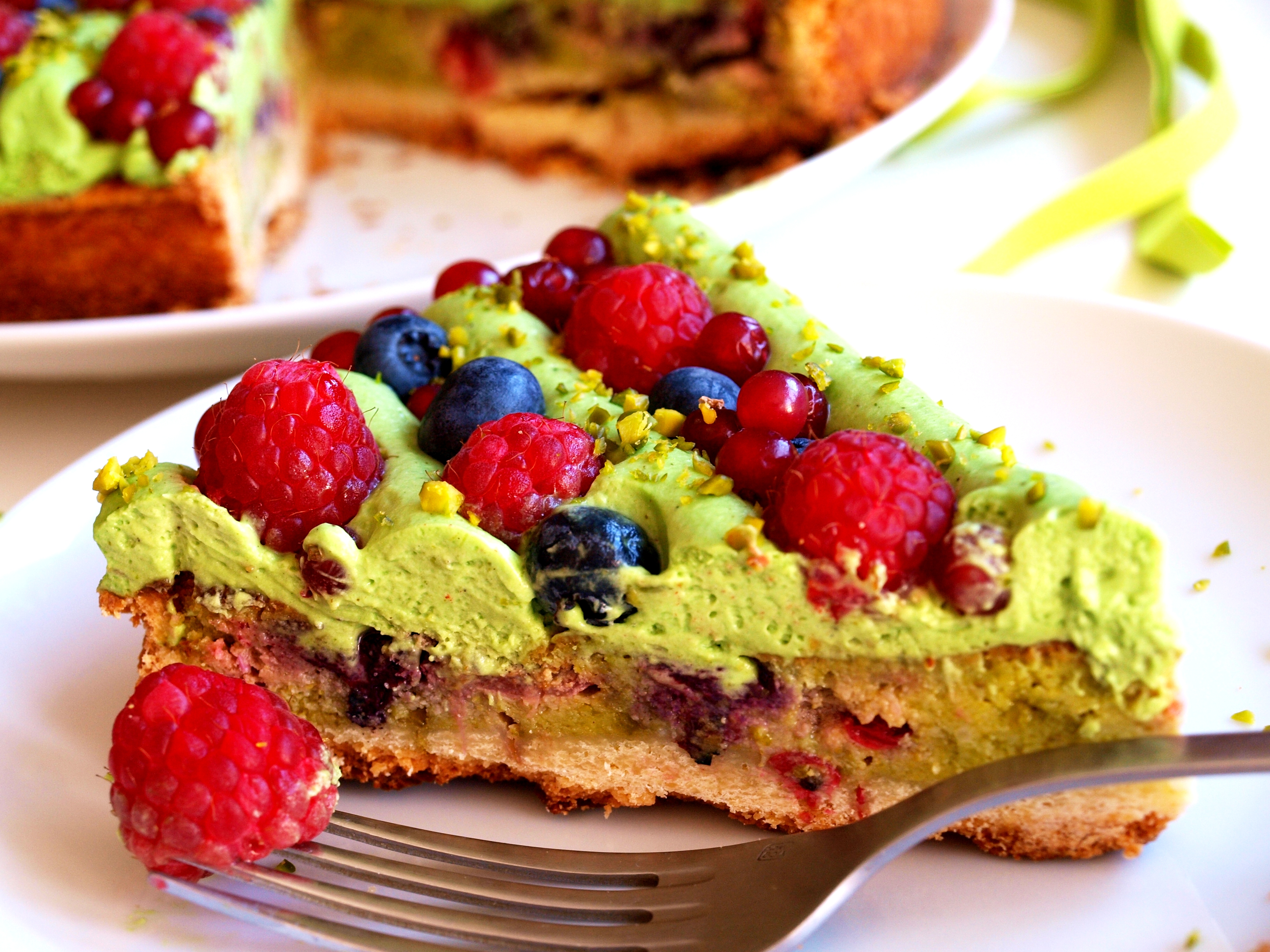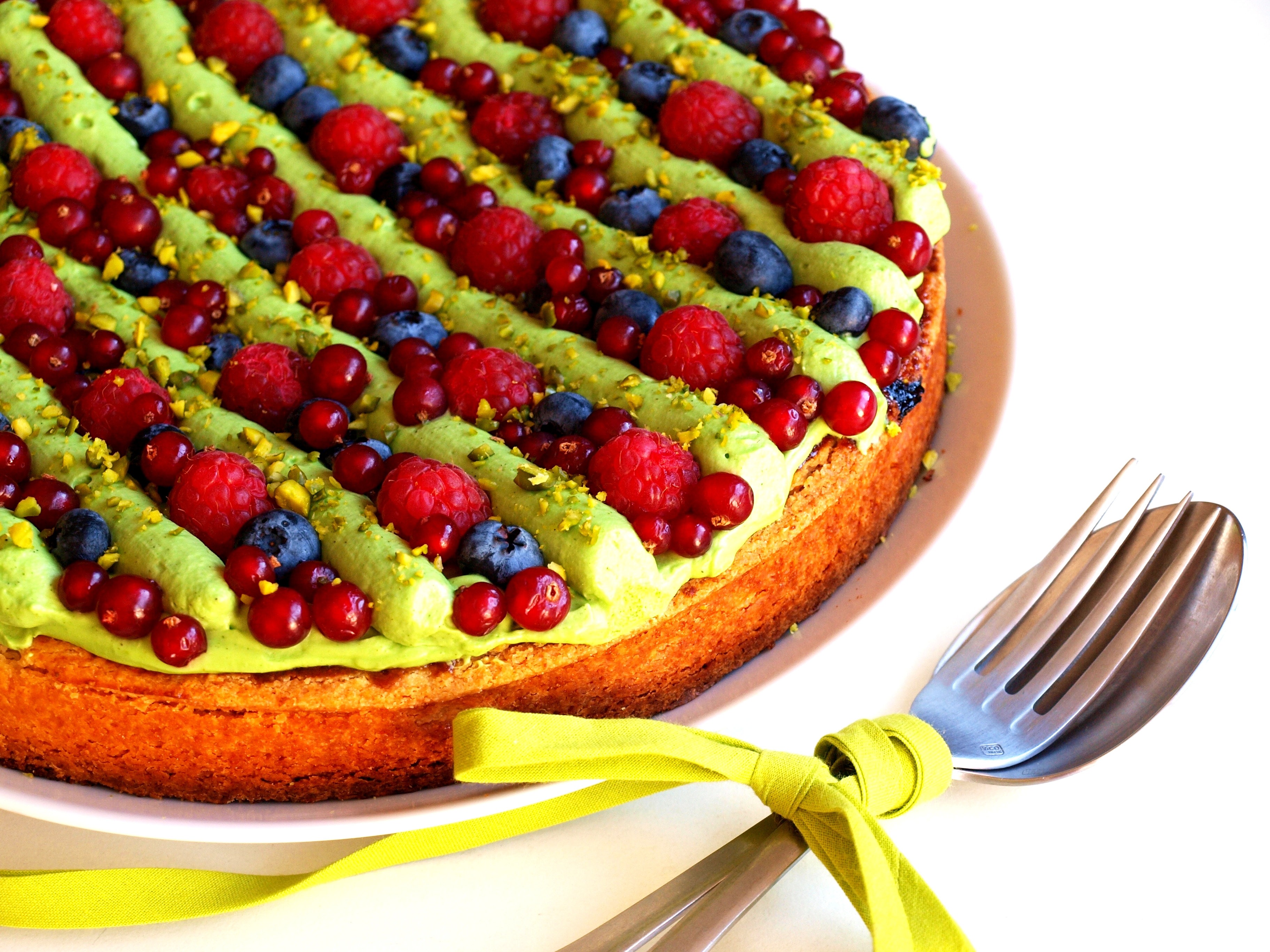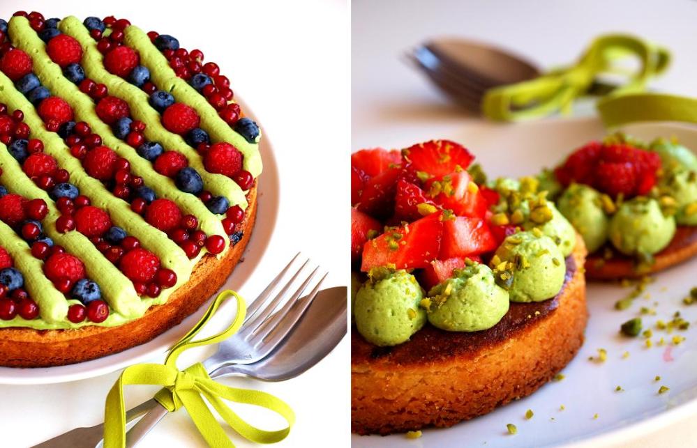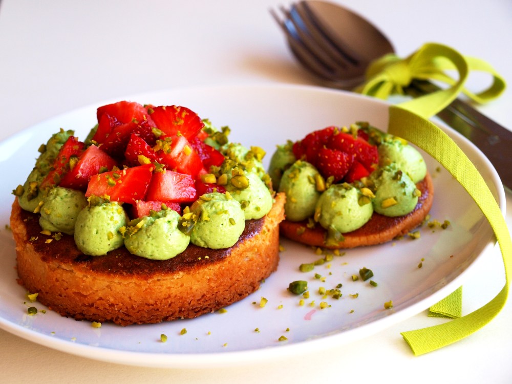 Nếu để ý kĩ thì có lẽ mọi người sẽ thấy mình rất thích dùng pistachio khi làm bánh. Lần đầu mình được mời thử 1 miếng bánh pistachio, ngay từ lúc nhìn thấy mình đã thấy không hề có hứng thú ăn chút nào, vì không hiểu sao đối với mình, màu xanh lá cây luôn làm mình nhớ đến cái gì đó độc hại, không ăn được hì hì! Nhưng mình vốn là người tham ăn ngon, tất nhiên sẽ thích thử nhiều thứ mới lạ, nên dù đối với mình không được ngon mắt cho lắm, mình vẫn không ngần ngại nếm thử. Một khi đã nếm thử rồi mình mới thấy không hề đáng tiếc tí nào, mùi vị pistachio khá lạ, không biết phải tả thế nào, thơm thơm bùi bùi, nhưng lại có gì đó thanh thanh không như các loại hạt khô khác. Cái quan trọng nhất là từ đấy mình không những không còn ngại dùng màu xanh lá cây vào các món bánh của mình nữa, mà thậm chí còn thường xuyên dùng hơn. Vì màu xanh kết hợp với màu vàng của bánh nướng chín thơm ngọt, hay màu đỏ, cam của các loại hoa quả chua chua dịu sẽ làm cho chiếc bánh trở nên rực rỡ bắt mắt hơn nhiều! Sau này khám phá thêm bột trà xanh cũng có màu xanh mướt nữa thì màu xanh bắt đầu thường xuyên có mặt trong góp bếp của mình.