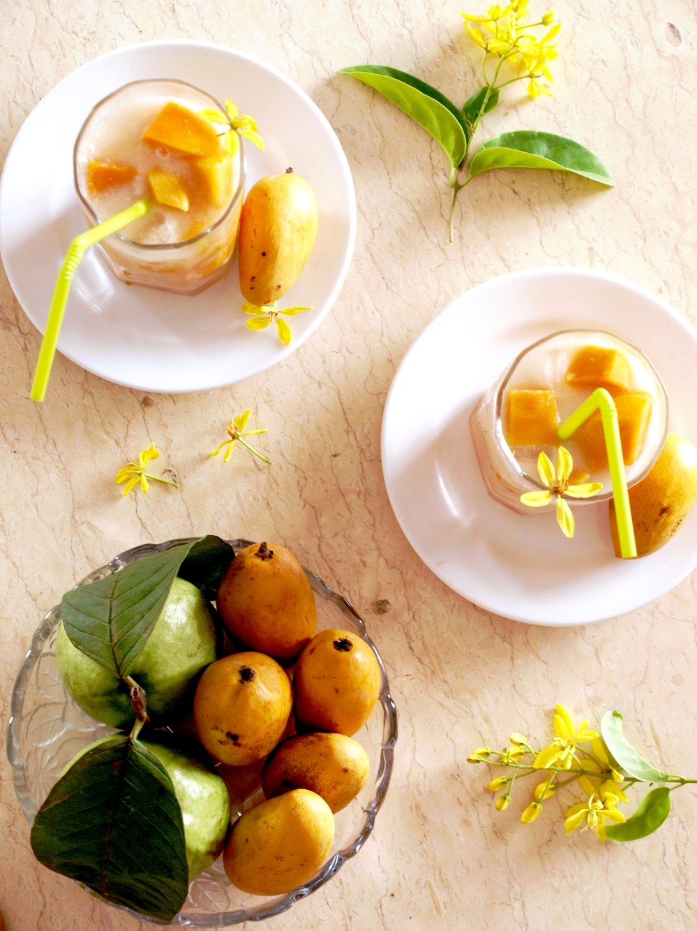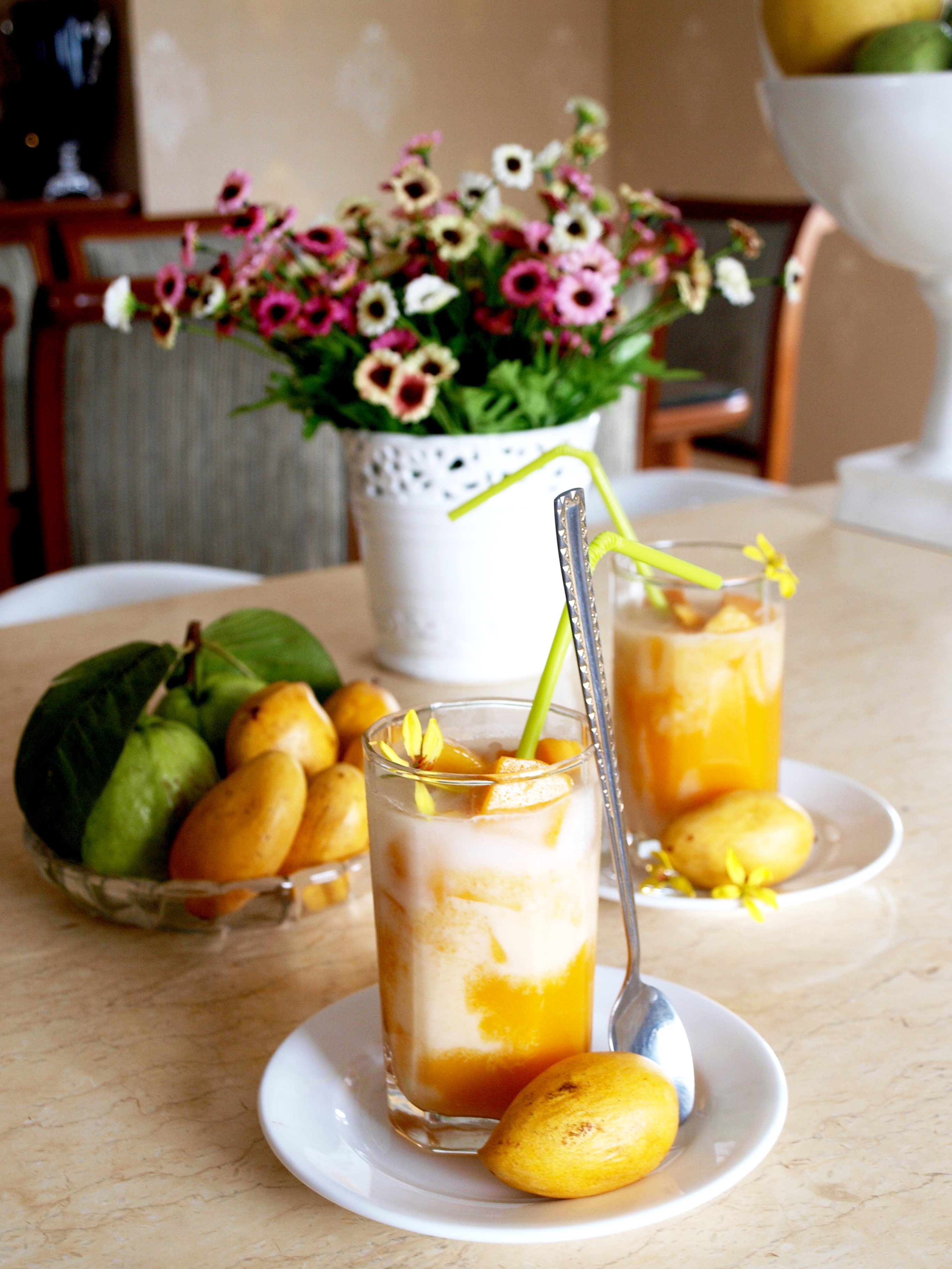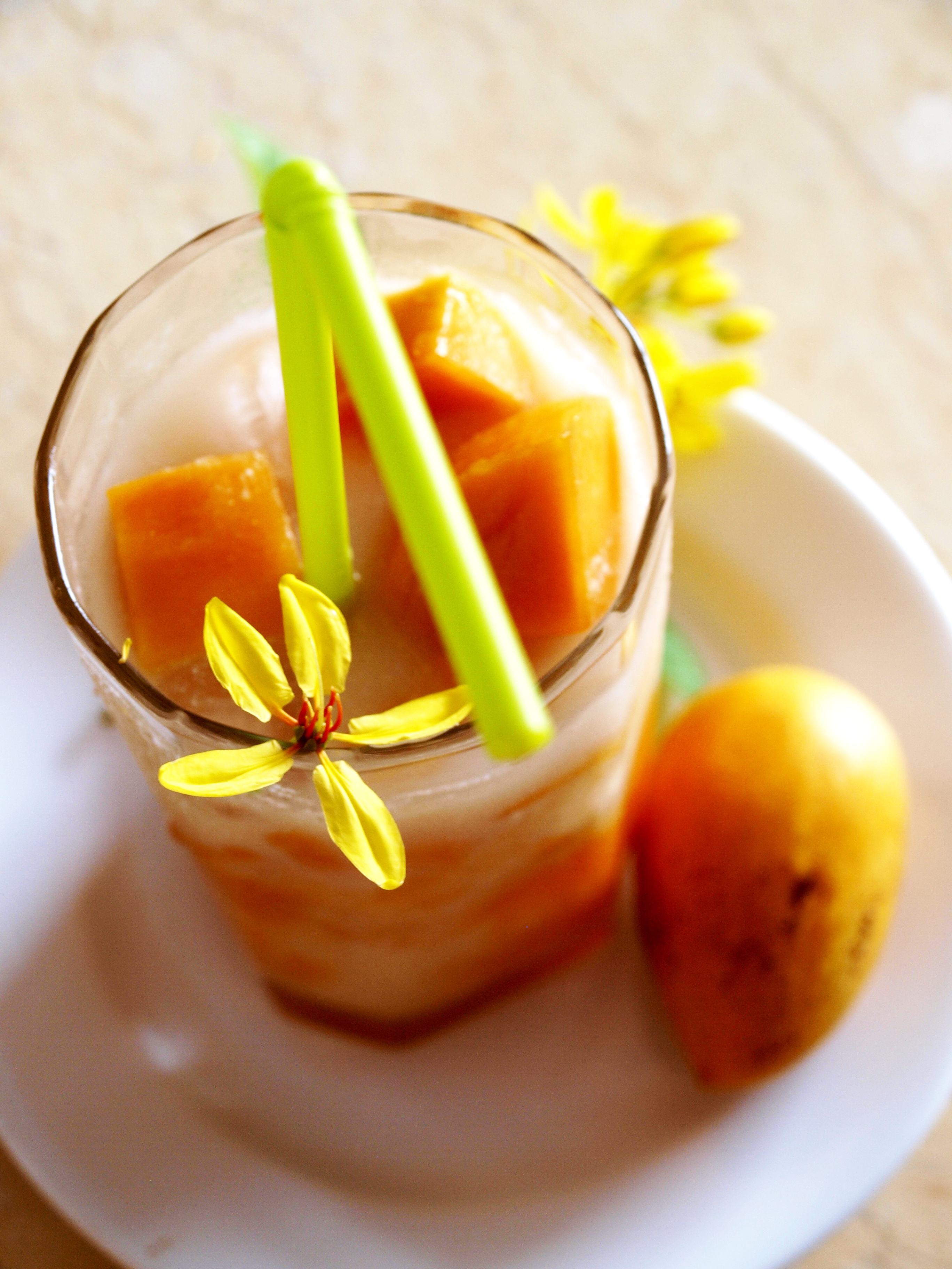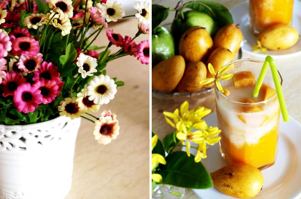 Mấy ngày trước trời mưa nên ổi và đu đủ không được ngọt lắm, riêng xoài thì lại rất ngọt, không hiểu nếu trời ko mưa thì nó còn ngọt đến thế nào nữa! Quả xoài bé xíu mà ngọt sắc, thơm lừng cả 1 góc bếp, thịt xoài ăn lại dẻo dẻo rất lạ. Mình tham hái nhiều quá nên ăn mãi không hết, chiều về ngồi nhà buồn buồn chân tay vì lâu lâu không nướng mẻ bánh nào, thế là tận dụng hoa quả từ vườn làm mấy cốc sinh tố. Gọi là công thức cho oai chứ thực ra sinh tố thì chắc ai cũng biết làm rồi, nguyên liệu thì đa dạng và có thể biến tấu tùy thích nhưng mình vẫn cứ ghi cách làm ra đây để mọi người tham khảo nhé!!!!