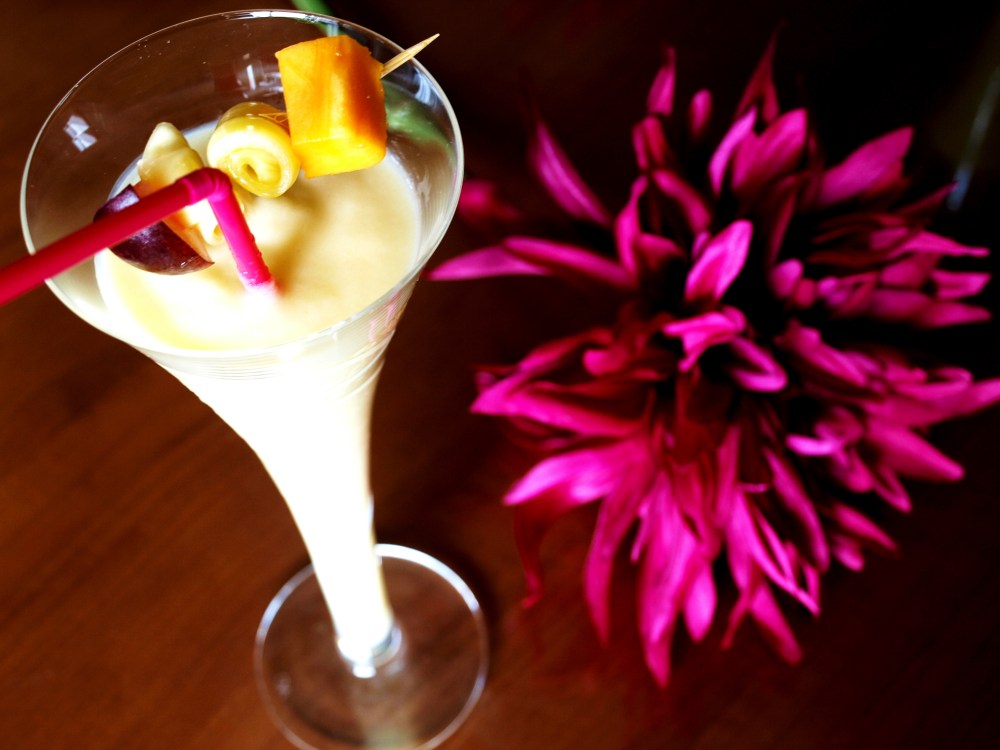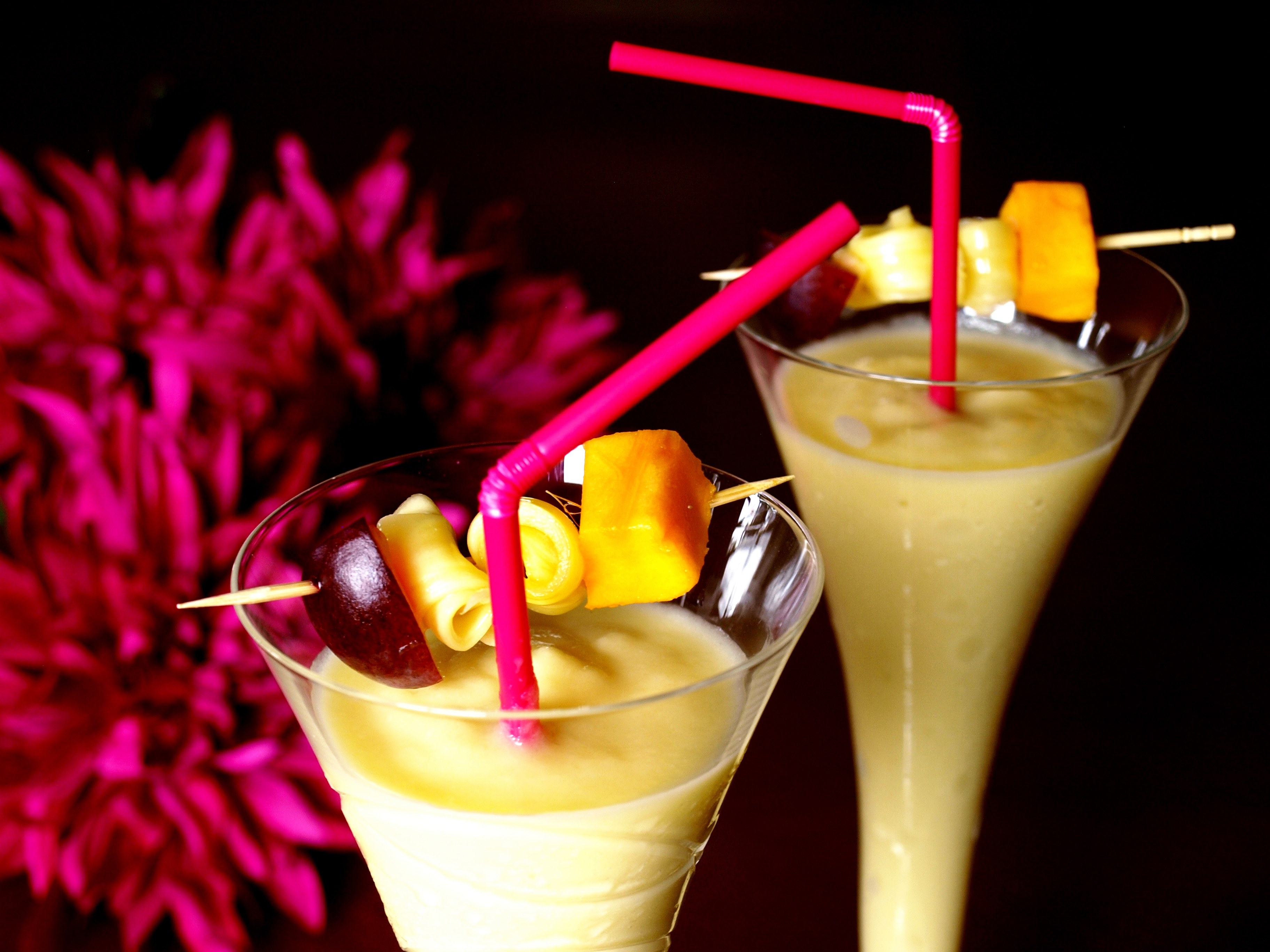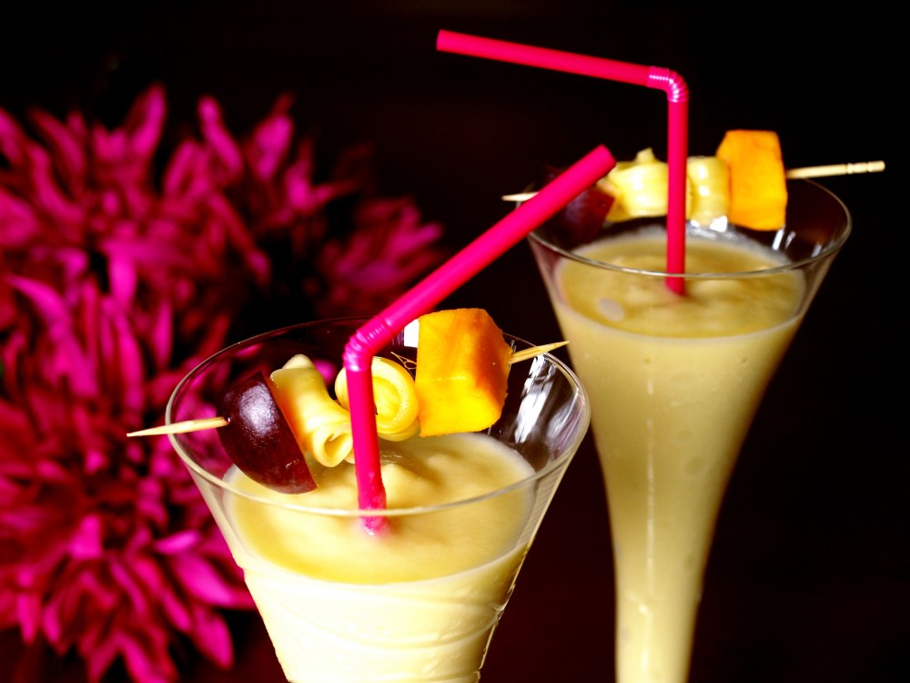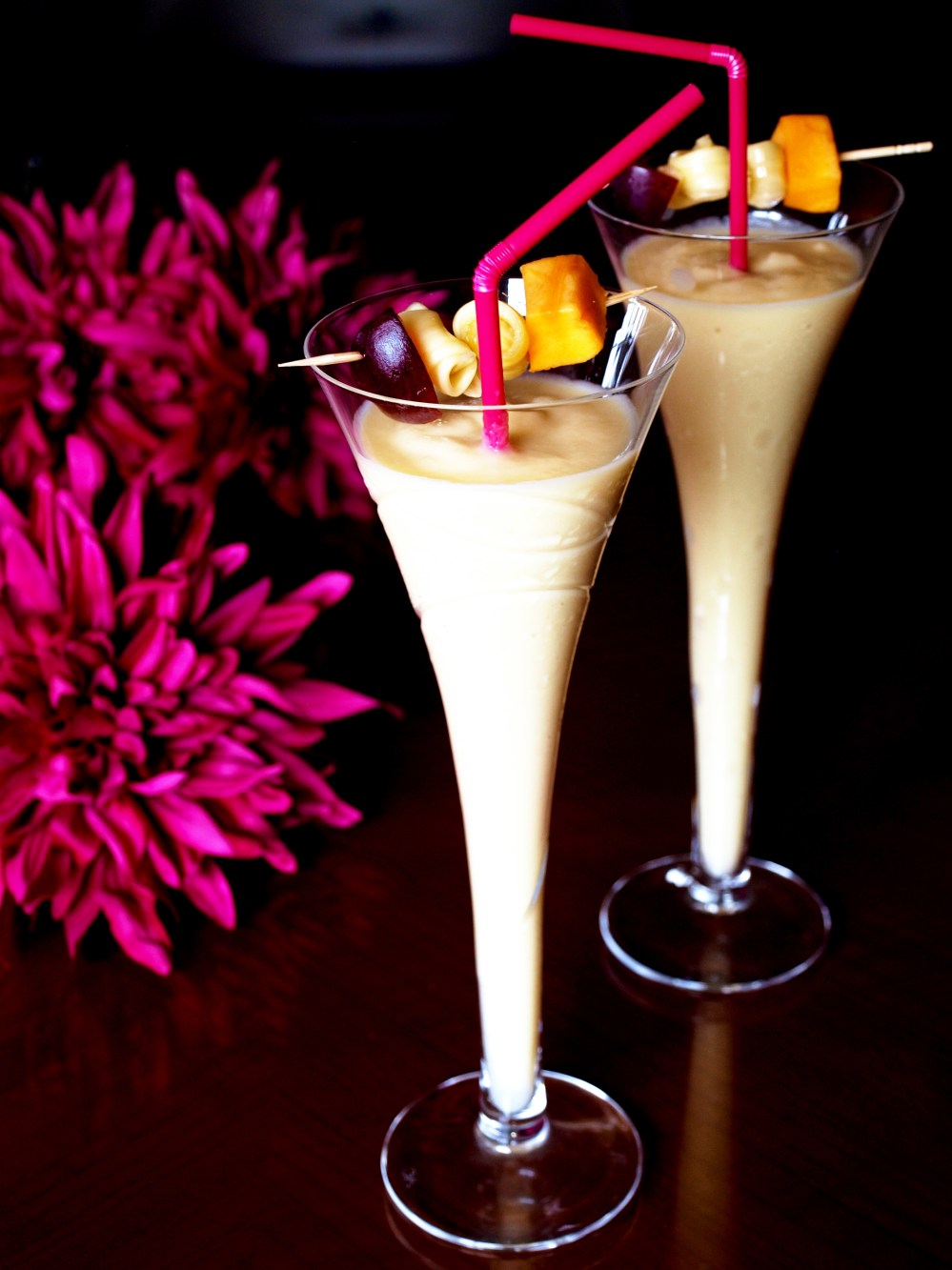 - Rót vào cốc, dùng tăm xiên hoa quả tươi rồi trang trí cốc sinh tố.