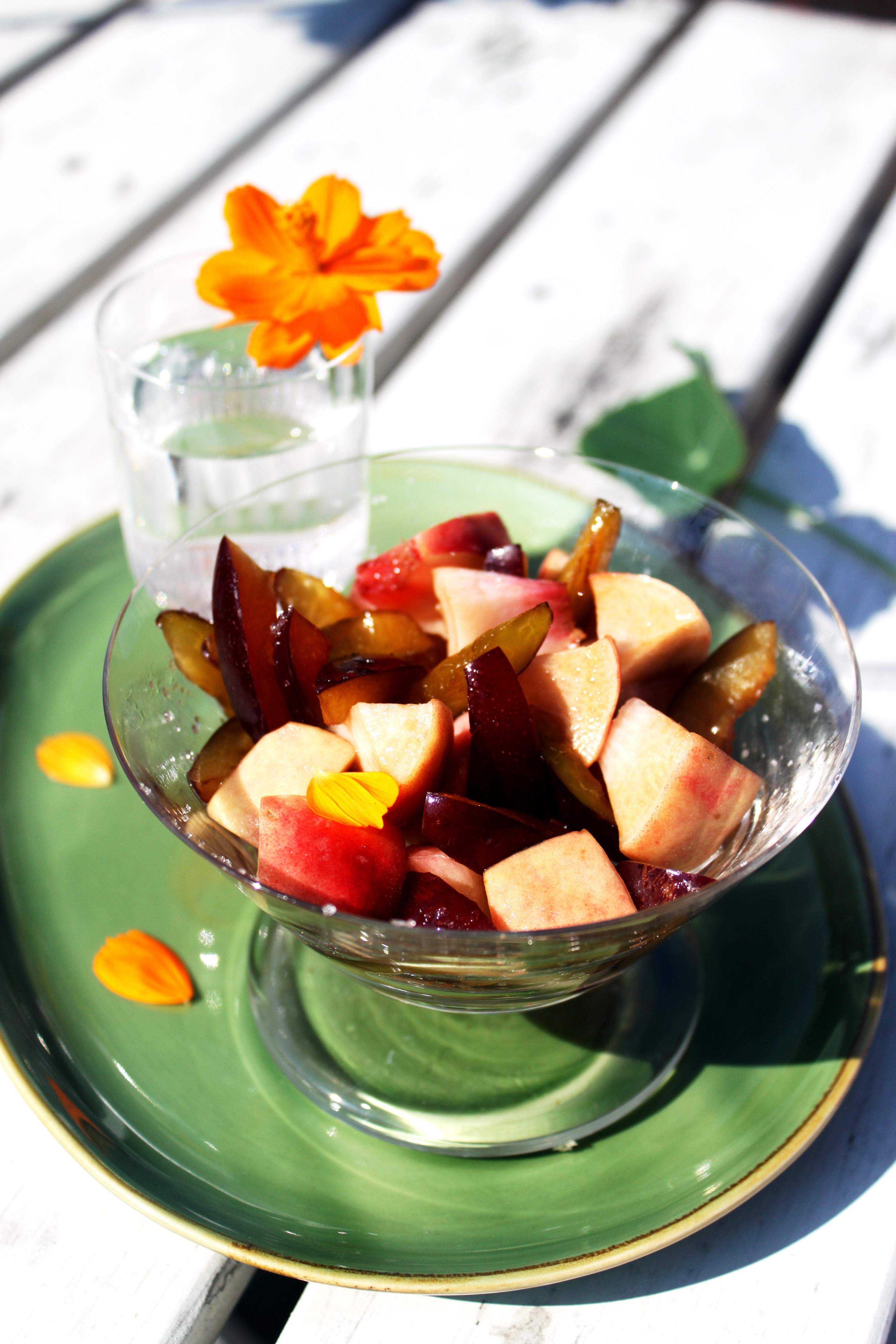 - Đào, mận bỏ hạt, cắt miếng nhỏ, trộn với đường và rượu rum để vào tủ lạnh 30’ cho ngấm.