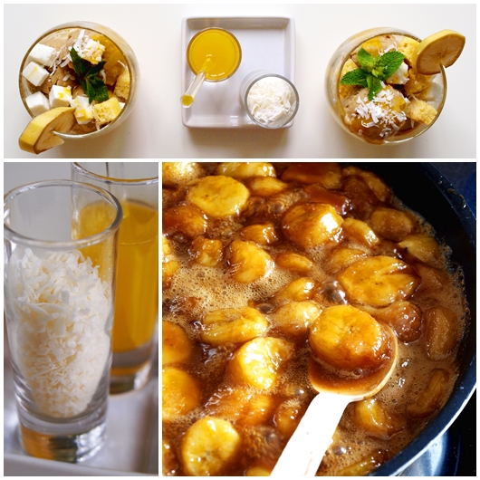Kem chuối sốt với đường nâu rất thơm và dẻo, flan dừa và thạch dừa đều ngọt và ngậy, nước sốt xoài-chanh leo chua và thanh sẽ cân bằng lại mùi vị cho món tráng miệng. Nếu không có thời gian cầu kỳ, bạn hoàn toàn có thể cắt hạt lựu bánh flan, thạch sữa dừa để xuống đáy cốc, múc vài viên kem lên trên và cuối cùng rưới sốt xoài xay và chanh leo lên trên, rắc chút cùi dừa khô nữa nhé.  Món tráng miệng chứa đầy hương vị của mùa hè, của nắng vàng và của những kì nghỉ nơi miền nhiệt đới nhiều nắng và gió biển!
