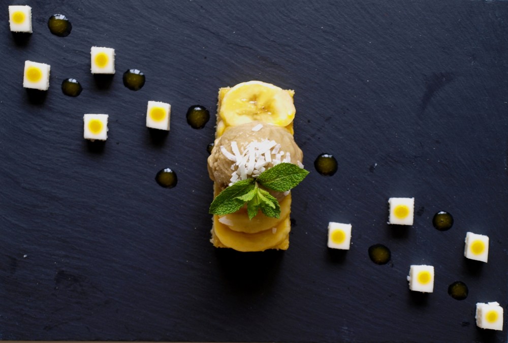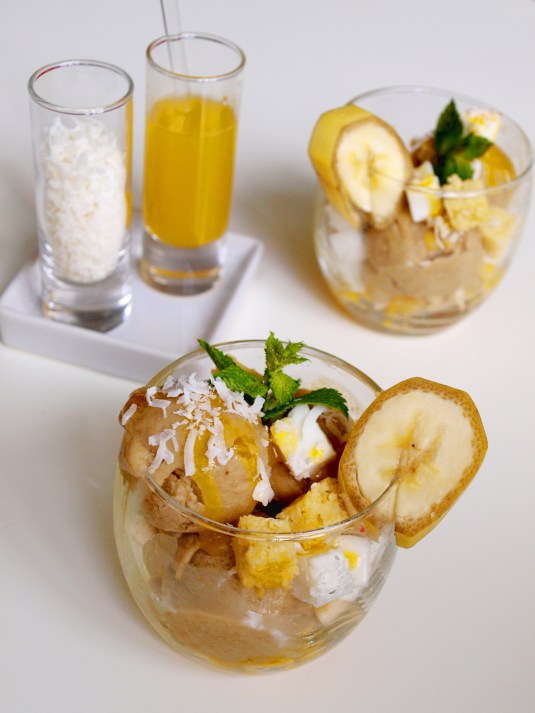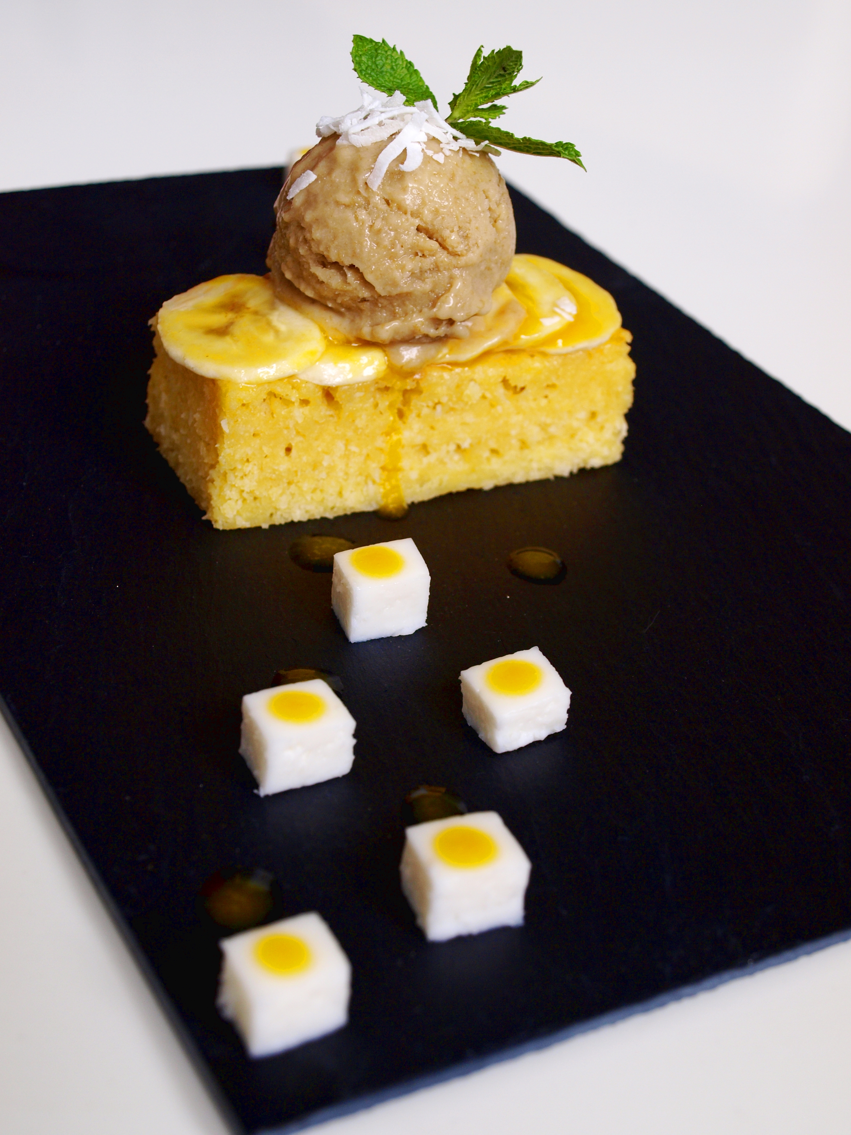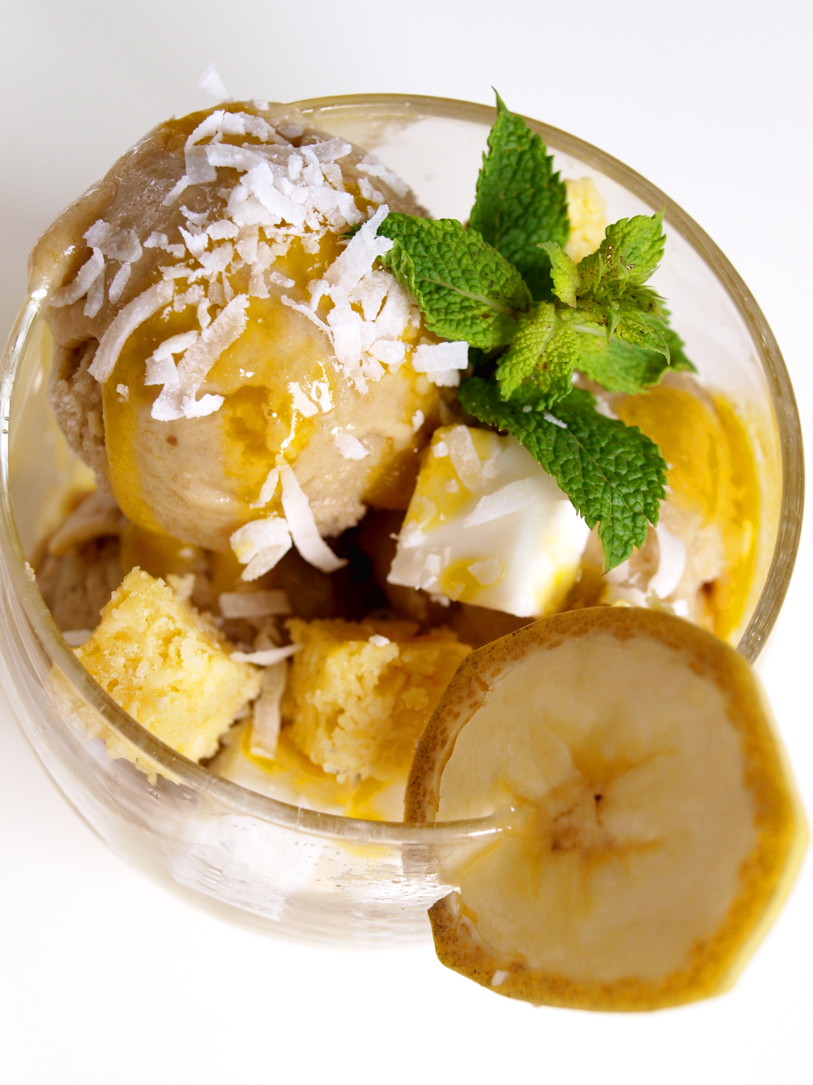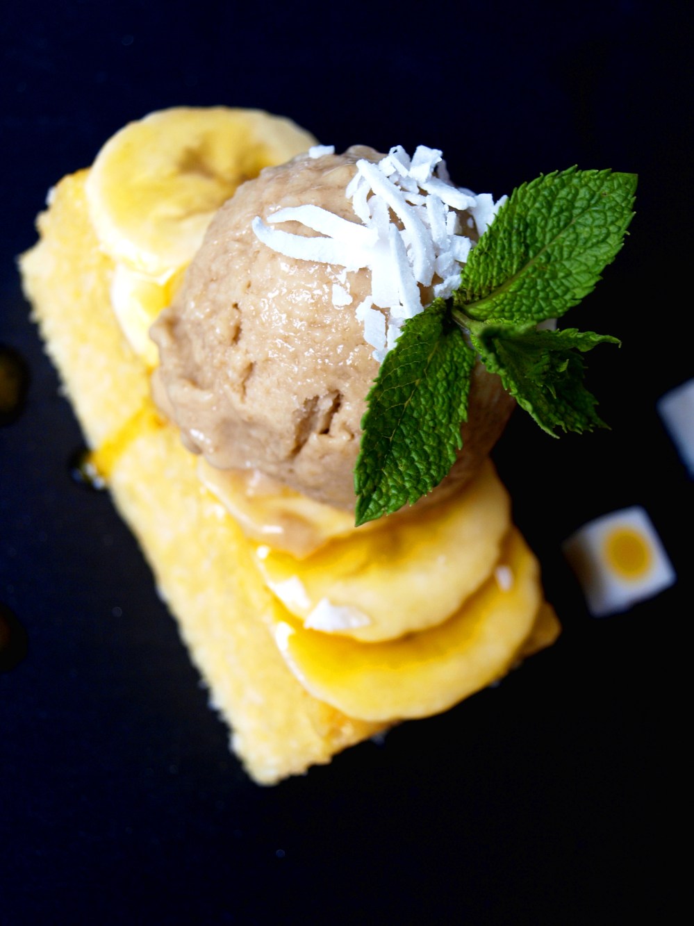Kem chuối sốt đường nâu và bánh flan dừa – xoài – chanh leo (Banana and brown sugar ice cream and coconut-mango-passion fruit flan)