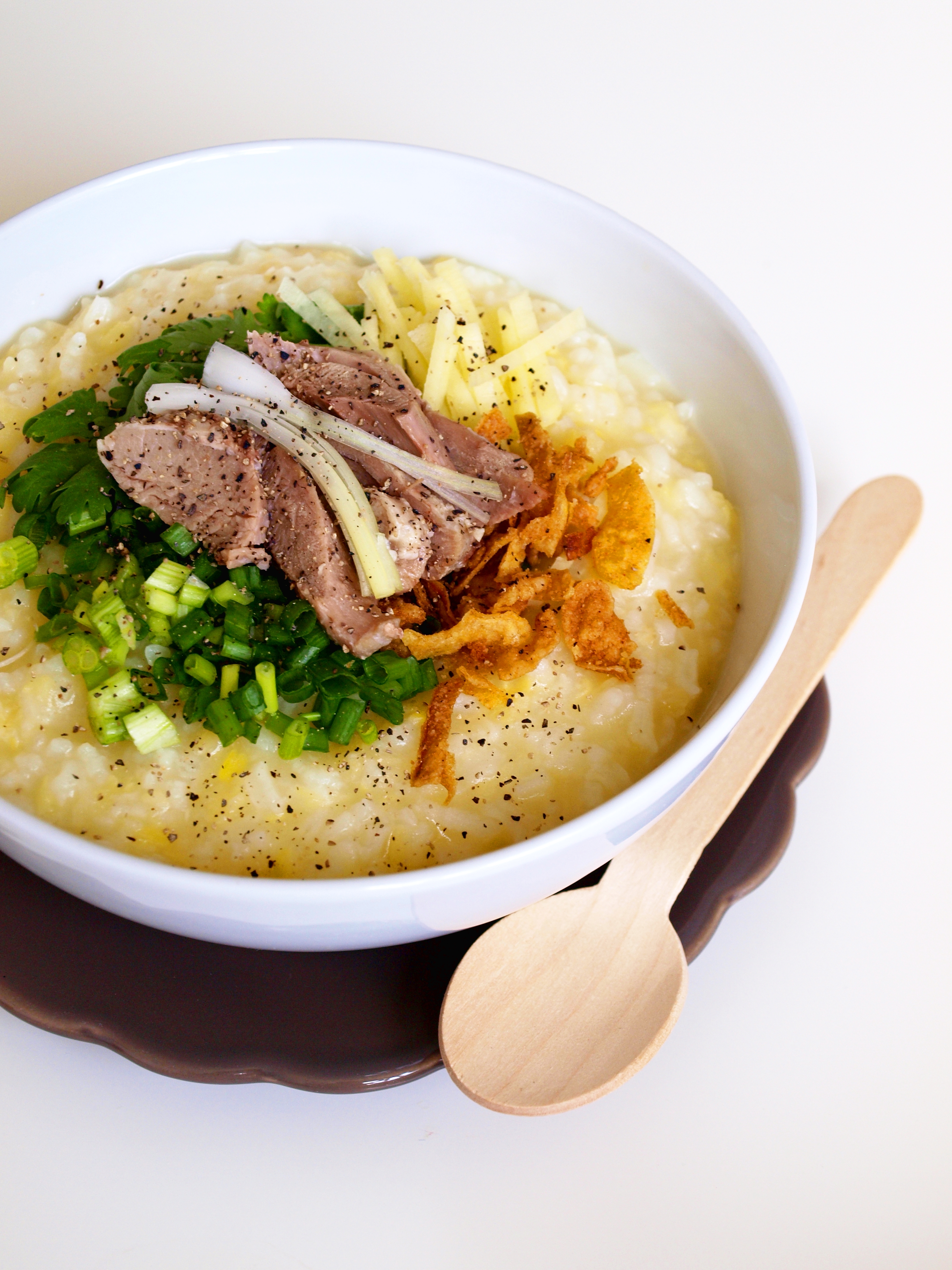 Đợt mình bị ốm vừa rồi, có một chị bạn đến nhà nấu cho mình món cháo đậu xanh rất ngon, từ đấy mình đâm ra nghiện cháo, đầu tiên là vì cháo đậu xanh rất ngon, và dễ ăn cũng như dễ nấu, lại ít bát đũa phải rửa :). Lần này nấu cháo vịt cũng là rất tình cờ vì tối hôm trước mình nấu món canh măng vịt. Vì bận học không có nhiều thời gian nên mỗi lần đi chợ mình thường đi cho cả tuần, thịt cá sẽ được trữ trong ngăn đá. Lần trước mua đùi vịt được đóng gói 2 cái một vào túi hút chân không nên về mình để nguyên vào tủ đá, đến tối qua muốn nấu 1 đùi cho 2 người ăn thôi thì chịu rồi không có cách nào tách 2 đùi ra mà không phải rã đông. Thế là mình ninh luôn cả 2 cái đùi, khi vịt chín thì chắt 1 nửa nồi nước và cất 1 cái đùi vịt để nấu canh măng, còn lại để sáng nay nấu cháo cho tiện.
