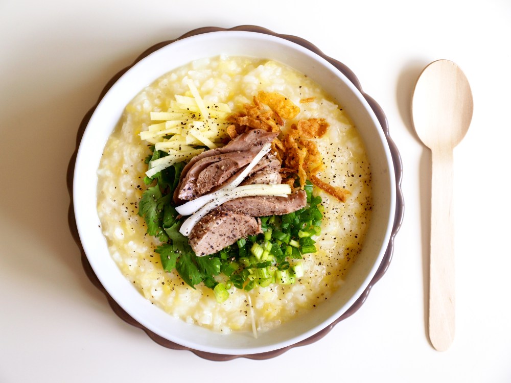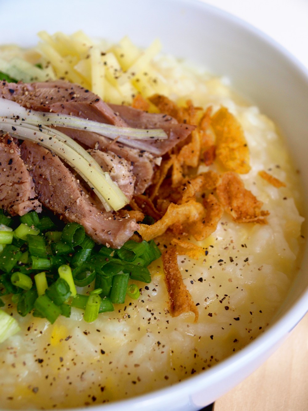 Cháo vịt ăn kiểu ở nhà thường là để thịt vịt thái miếng ra riêng, lúc ăn thì ăn kèm với nước chấm gừng chua cay ngọt cho đỡ ngán. Nhưng mình lại cho luôn vịt vào nồi cháo vì mình thích ăn cháo là chính, lại tiện hơn không phải lích kích pha nước chấm, chỉ cần 1 bát to nhiều tiêu bê vào phòng vừa đọc sách, xem phim vừa chén thôi! 🙂
