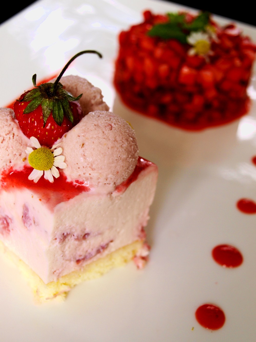 Vẫn tiếp tục với các trò nghịch ngợm bày và kết hợp các hương vị thành một đĩa tráng miệng hấp dẫn và tinh tế như mình vẫn mơ ước khi đi ăn hàng, đọc báo ẩm thực hay xem Top chef, Master chef, với món kem này mình chọn bày cùng với cheesecake và một ít dâu trộn bạc hà. Vị bạc hà the mát khá hợp với dâu, thay vì bày dâu cắt miếng ăn kèm với cheesecake và kem, khi ăn mình sẽ xắn một miếng bánh và kem, xúc thêm 1 ít dâu trộn, quẹt qua chút sốt dâu nữa, tất cả các vị hòa quyện vào nhau trong miệng sẽ tạo nên một sự bùng nổ về hương vị rất chi là hay ho. 🙂