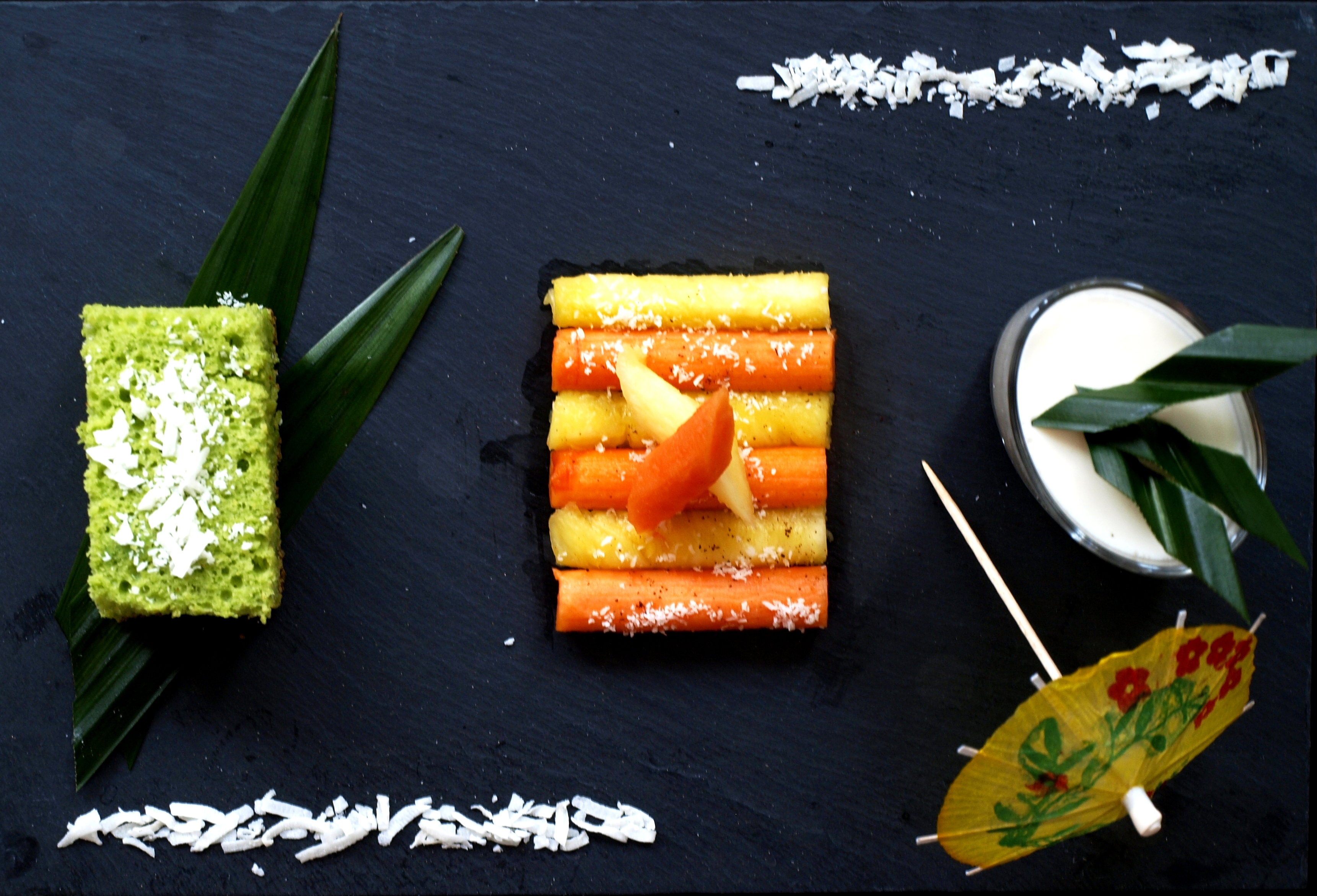 Món tráng miệng gồm 2 công thức chính là panna cotta sữa dừa dẻo dẻo thơm ngậy và bánh bông lan lá dứa thơm lừng, phải gọi là nức mũi luôn, ăn kèm với một ít hoa quả nhiệt đới còn lại trong tủ lạnh là đu đủ và dứa, ướp với chút rượu mùi Malibu, syrup đường mía và chút vanilla. Mình thì thấy đu đủ có màu cam, kết hợp với màu vàng tươi của dứa có thể mang lại màu sắc rực rỡ hơn cho món tráng miệng nhưng có lẽ vị xoài hoặc chuối sẽ hợp với dứa hơn là đu đủ.