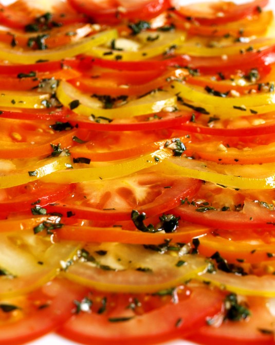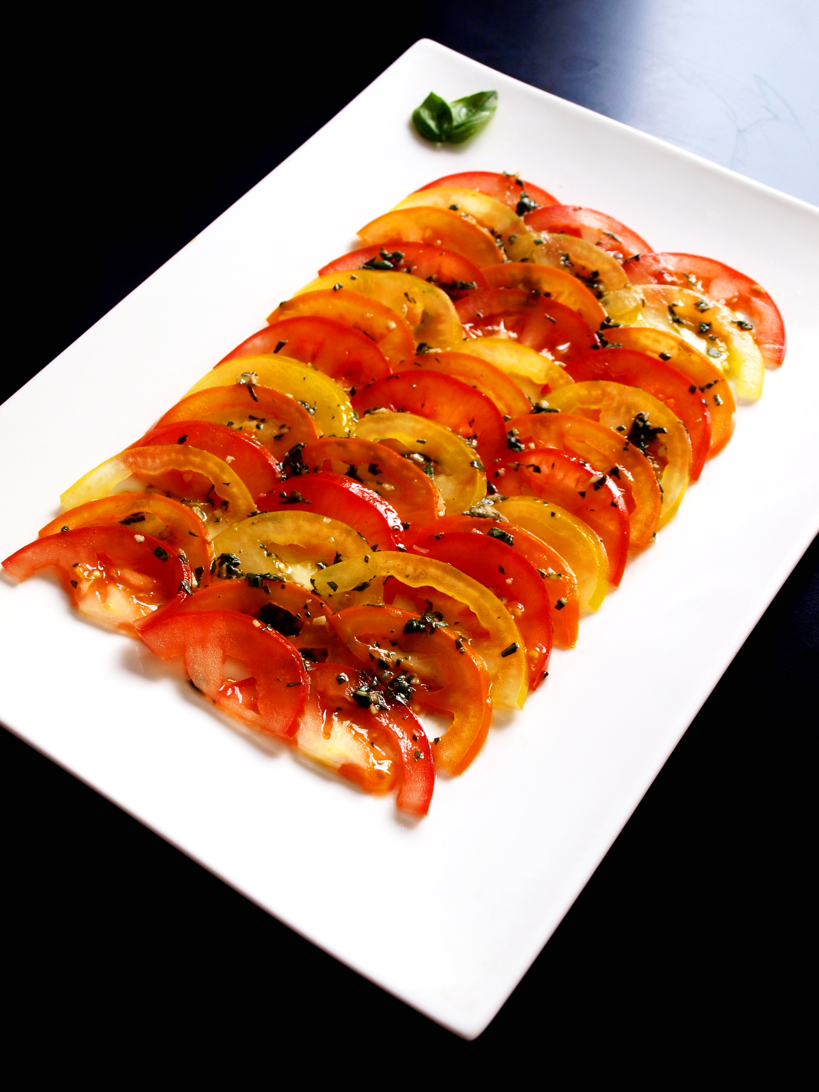 Carpaccio cà chua mình chỉ cho 1 vài giọt nước cốt chanh thôi vì vốn cà chua đã có vị chua rồi. Với các loại carpaccio hải sản hoặc gà thì khác, nhưng riêng với carpaccio thịt bò và cà chua thì mình thấy thêm vào nước sốt lá húng quế bằm nhuyễn làm cho vị món ăn dậy hẳn lên, mùi vị trở nên hấp dẫn đến mức đối với mình thì thành phần này dường như là không thể thiếu.
