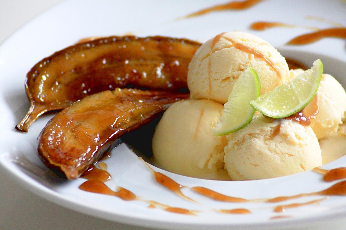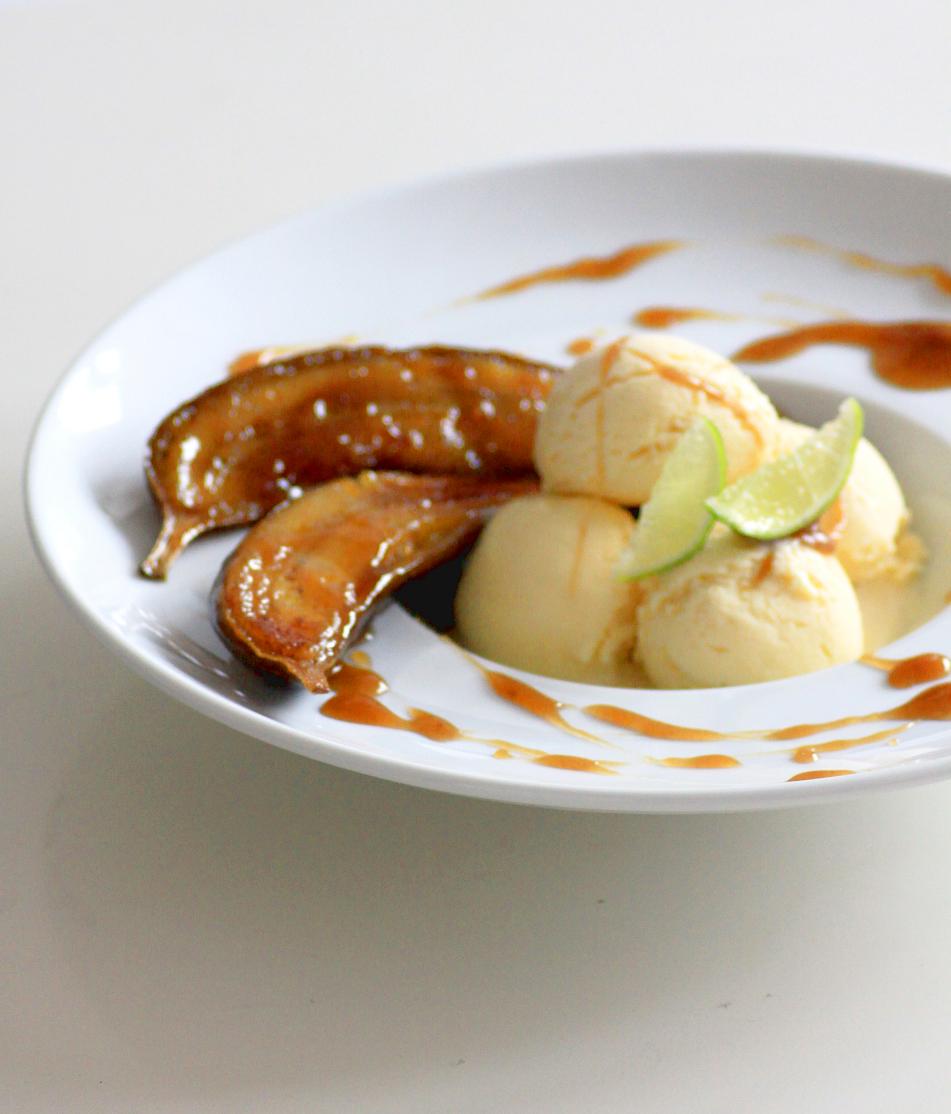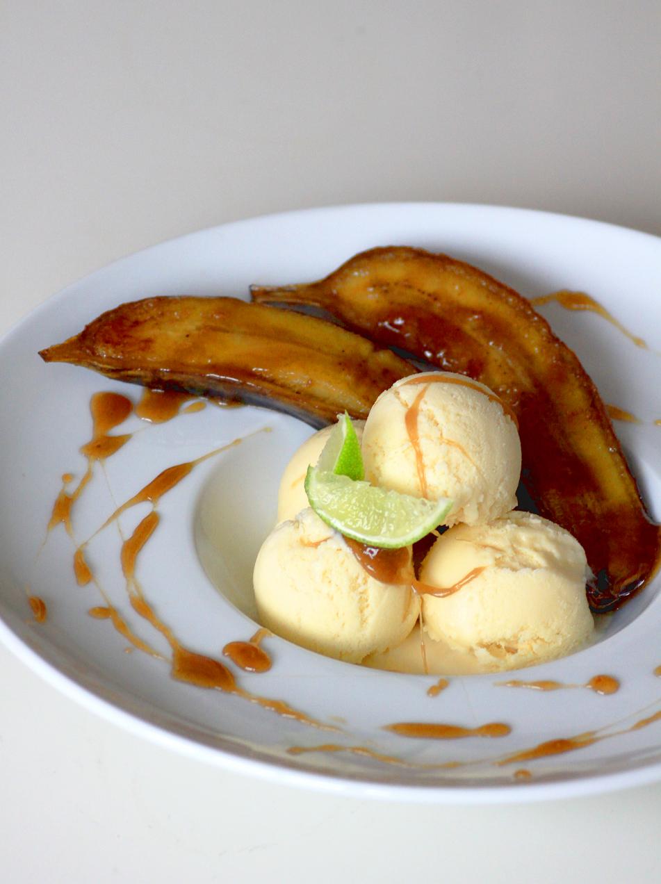 Mình lại rất thích ăn kem cùng với bánh hoặc hoa quả nướng mới ra lò, lúc ăn thì xắn 1 miếng bánh, rồi xúc 1 thìa kem, 2 vị nóng lạnh kết hợp với nhau trong miệng rất đặc biệt. Vì thế lần này mình làm thêm chuối rô ti để ăn cùng với món kem này, kem ngọt nhẹ, chuối nóng chín mềm rưới thêm chút sốt caramel chanh óng ả rất hấp dẫn!