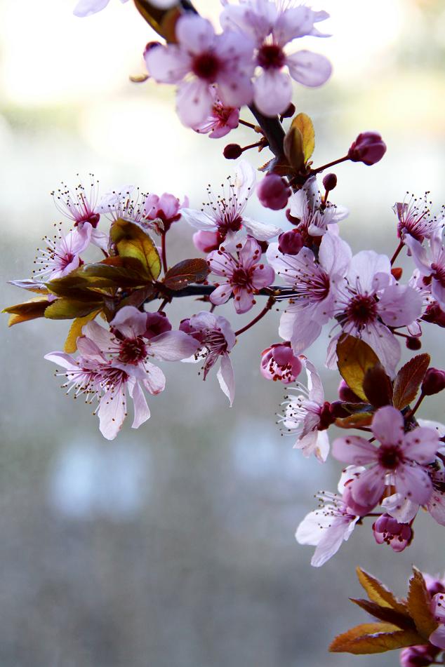 Thế nên những người háo hức mong chờ mùa xuân châu Âu đến sớm như mình, khi thấy trên những cành cây mận lá tím thẫm, trổ hoa những bông hoa 5 nắm màu hồng phơn phớt dịu dàng, hẳn trong lòng sẽ thấy gợn lên 1 tia hạnh phúc! Hoa mận khá giống hoa đào ở miền Bắc, nhưng sắc màu có phần phớt hồng tím hơn. Cánh hoa rất mỏng manh, nếu bạn đi dưới hàng cây hoa mận, chỉ cần một cơn gió nhẹ là mái tóc bạn đã vương đầy cánh hoa.