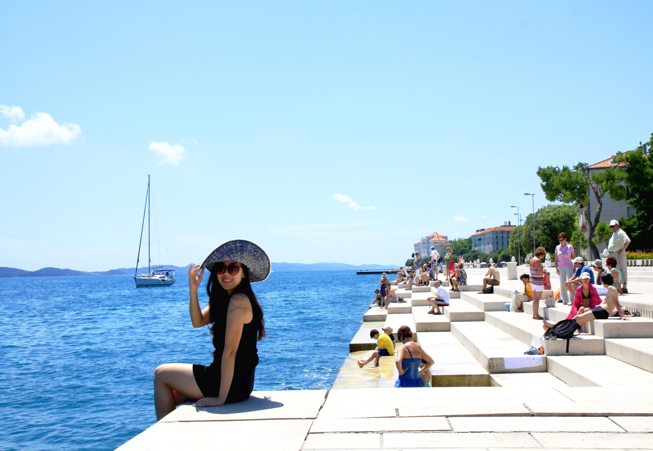 Đi lòng vòng trong phố cổ một lúc thì 2 bạn dắt nhau ra bờ biển. Bờ biển ở xung quanh phố cổ Zadar đều được kè lại rất đẹp, và chỗ đẹp và thú vị nhất có lẽ là bờ Đàn Biển (Sea Organ). Một đoạn dài của bờ biển là những bậc thang bằng đá cẩm thạch trắng dẫn xuống mép nước, những bậc thang nhấp nhô nối liền nhau như những phím đàn organ. Và điểm độc đáo và sáng tạo nhất là khi sóng biển đánh vào những đường ống được đặt trong lòng biển, phía dưới những bậc đá này, sẽ tạo nên những âm thanh trầm bổng rất hay như tiếng đàn của tự nhiên, của biển cả! ^^