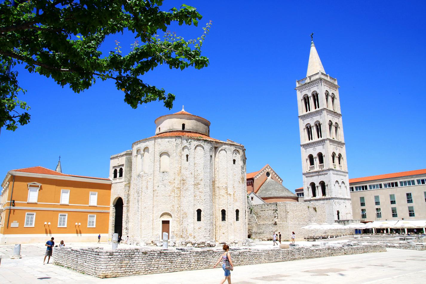 Vì từng chịu độ hộ của Đế chế La Mã trong thời gian khá dài nên khu phố cổ Zadar có rất nhiều công trình kiến trúc với phong cách La Mã. Phía dưới là một khu gọi là forum của thành phố, nơi trước đây người dân hay tập trung lại mỗi khi có dịp lễ tết hay dịp gì đó trọng đại. Ở chính giữa là nhà thờ Saint Donat và tháp chuông của nhà thờ nổi bật trên nền trời xanh ngắt.