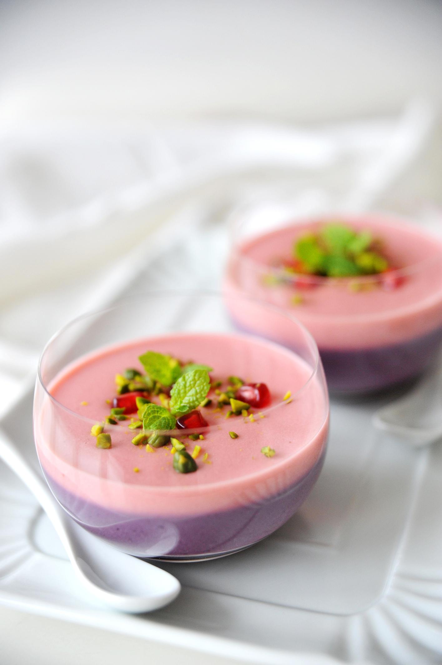 - Để nguội rồi trữ trong ngăn mát tủ lạnh ít nhất 3h rồi lấy ra trang trí với hạt lựu, lá bạc hà và hạt pistachio trước khi ăn.