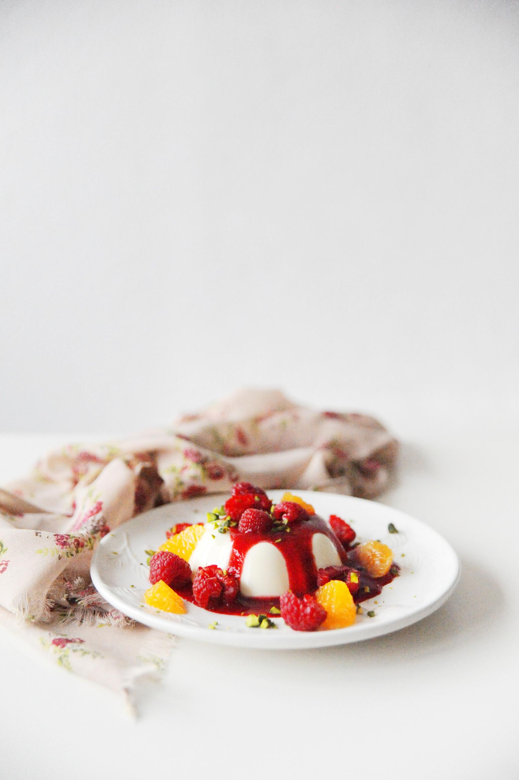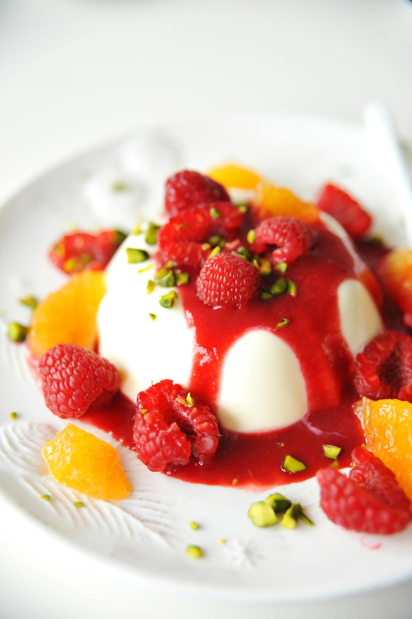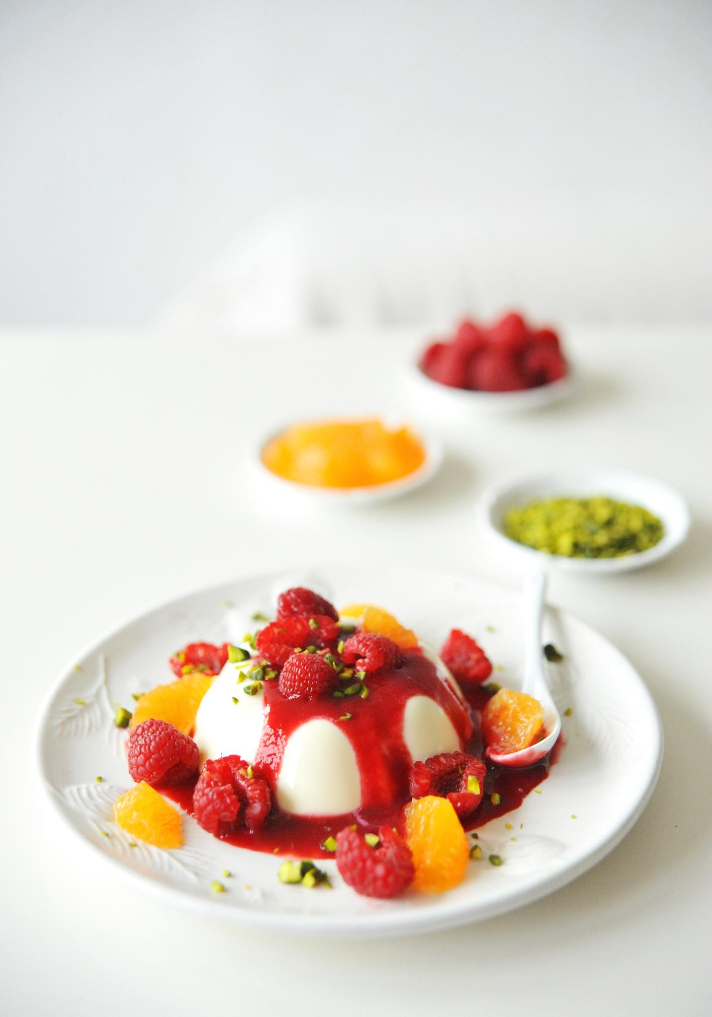 Panna cotta nhà mình ăn theo kiểu phải cho thêm thật nhiều hoa quả, ở đây mình cho thêm quýt và mâm xôi, rồi rưới thêm sốt dâu đỏ tươi sóng sánh rất hấp dẫn, và cuối cùng mình rắc thêm 1 chút hạt pistachio để điểm thêm màu xanh và thêm vị sần sật cho vui miệng. 🙂