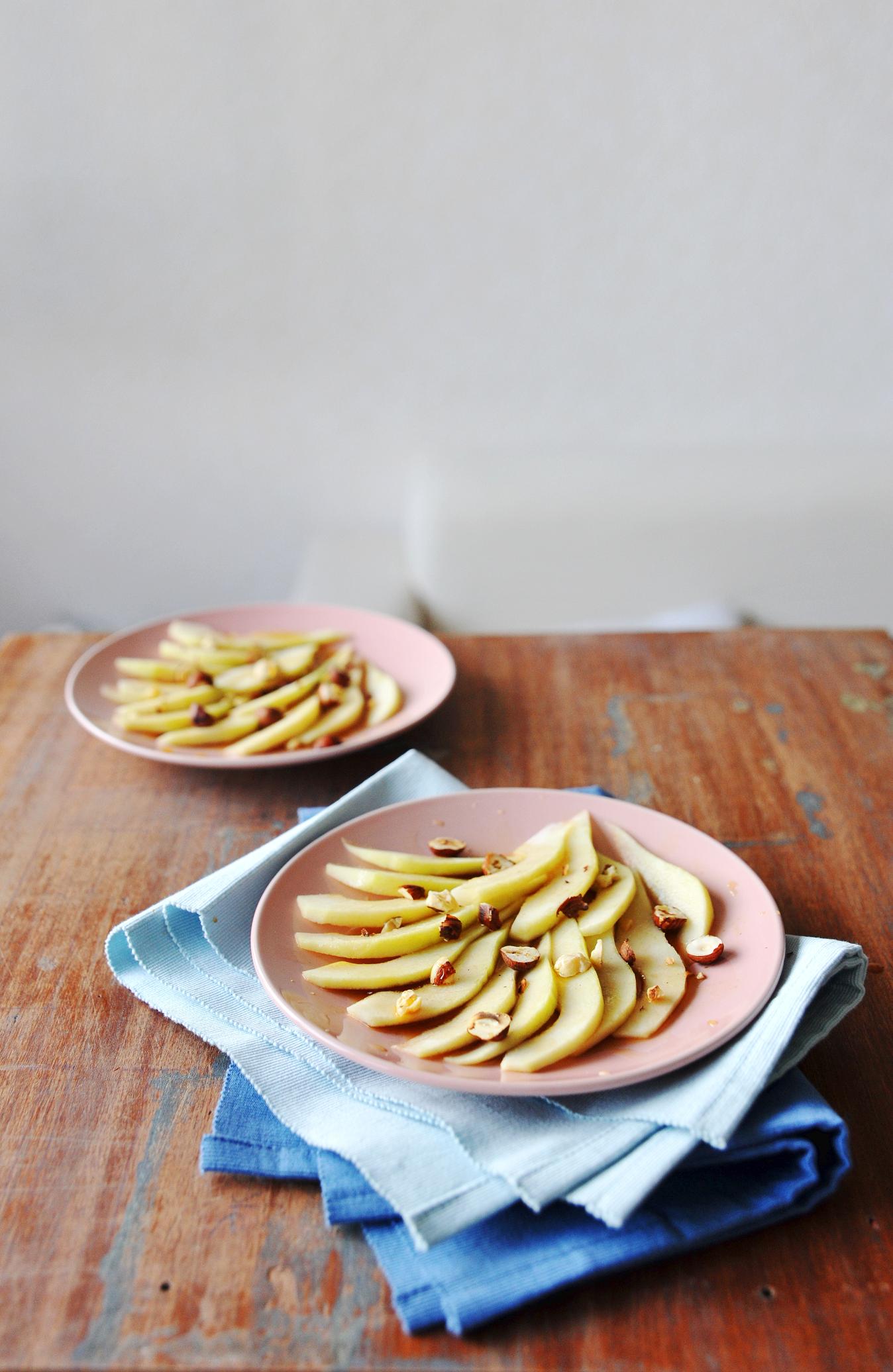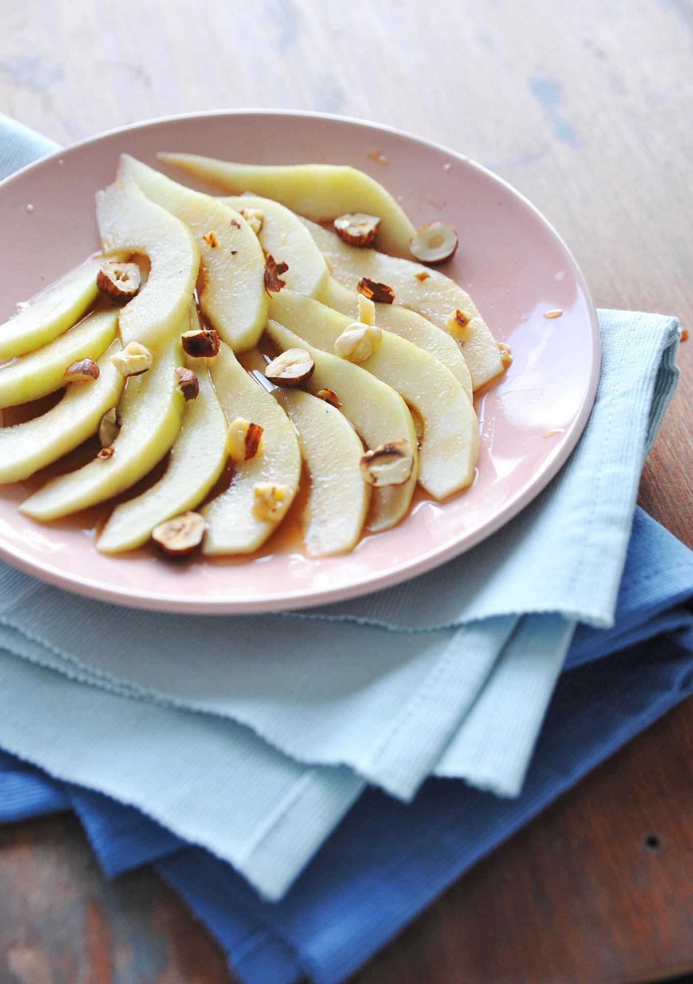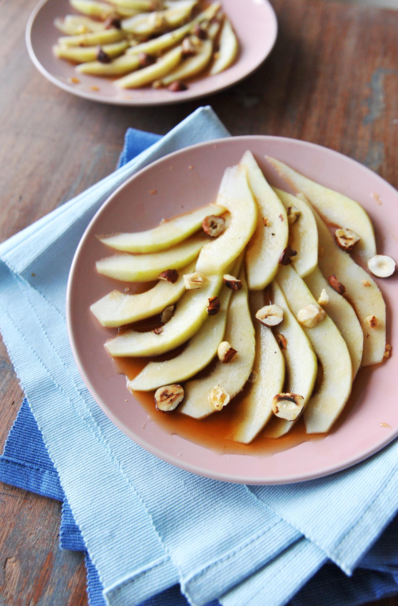 - Rưới syrup trà mật ong lên các miếng lê rồi rắc hazelnut lên trên.
