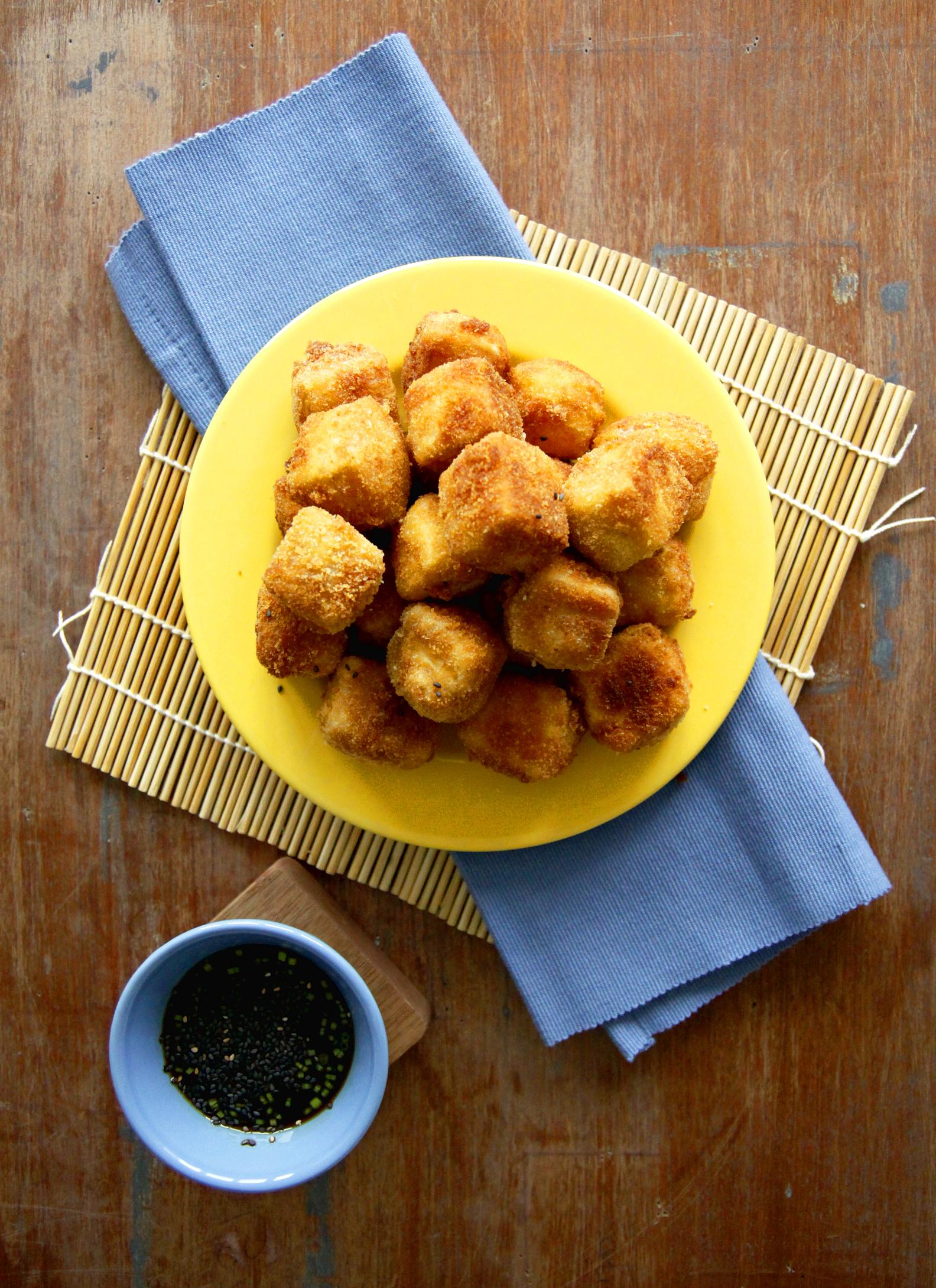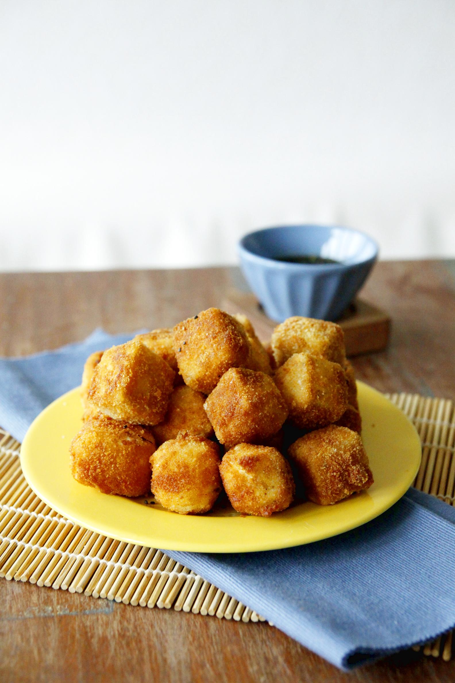 - Nhanh tay nhúng miếng đậu lần lượt vào bát trứng, rồi lăn đều các mặt qua bột ngô và cuối cùng lăn phủ đều bột chiên xù rồi thả đậu vào chảo dầu.
