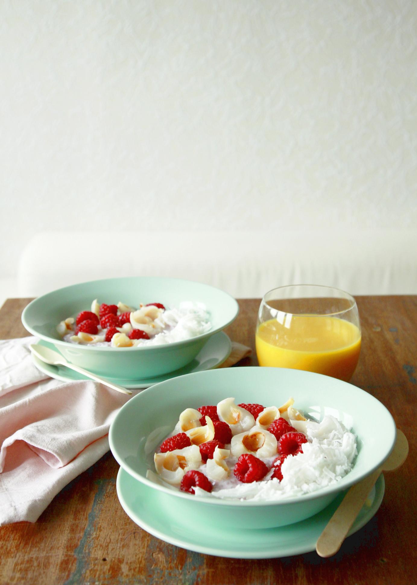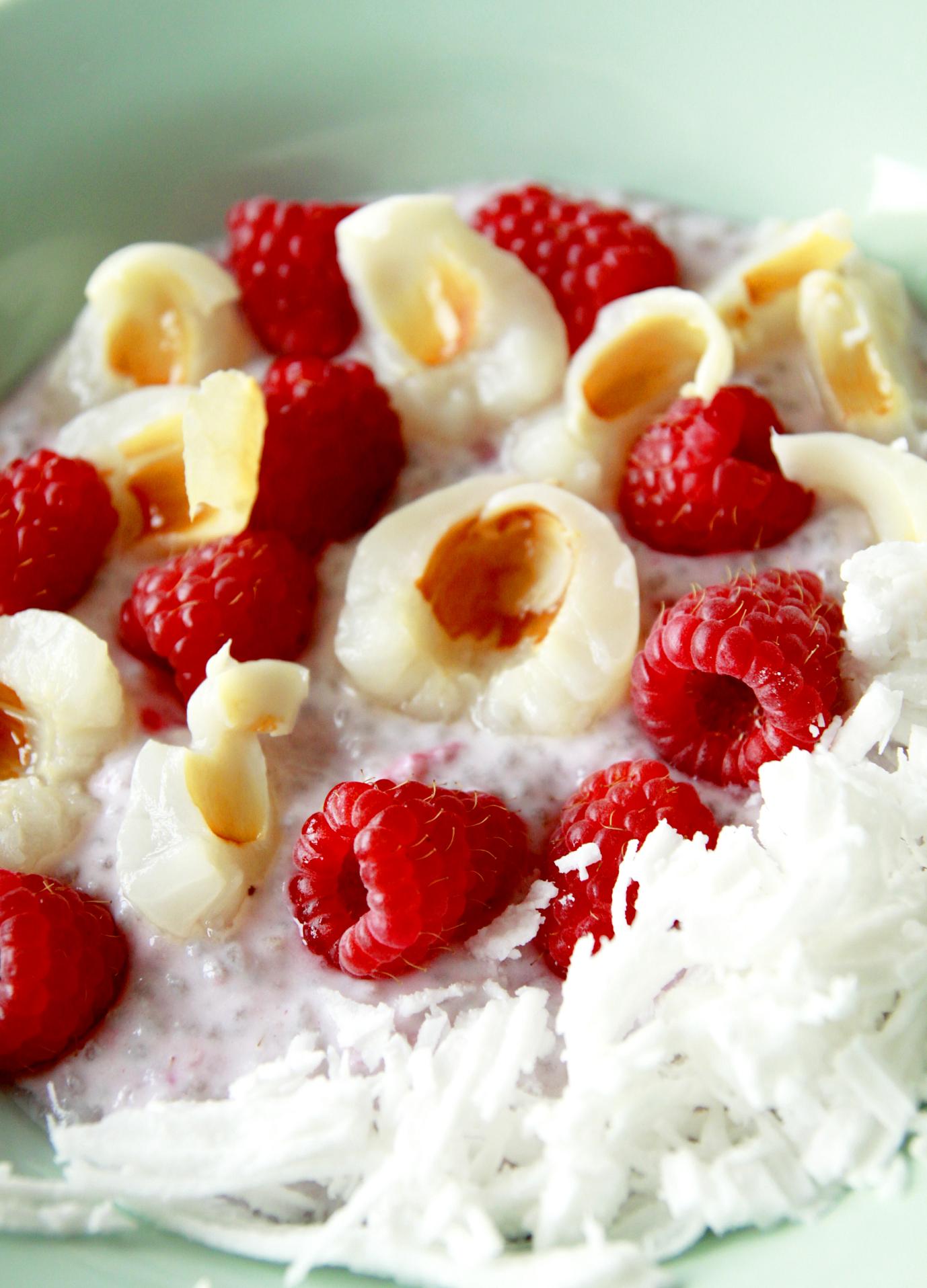 Món pudding này mình rất mê vì kết hợp 2 vị mình thích là mâm xôi và vải. Buổi sáng tỉnh dậy, vào bếp, mở tủ lạnh lấy bát chia ra, vừa tháo màng bọc thực phẩm là mùi sữa chua thơm mát đã tỏa lên làm mình tỉnh cả ngủ. Khi ăn thì từng vị hiện lên rất rõ rệt, sữa chua dìu dịu, mùi ngầy ngậy của cốt dừa và dừa nạo, mùi thơm thanh mát của vải và mâm xôi. Nói chung với mình đây đã trở thành 1 món gây nghiện, nhất là khi không phải làm gì, chỉ ngoáy vài cái rồi đi ngủ là yên tâm hôm sau có đồ ăn sáng ngon lành hấp dẫn! ^^