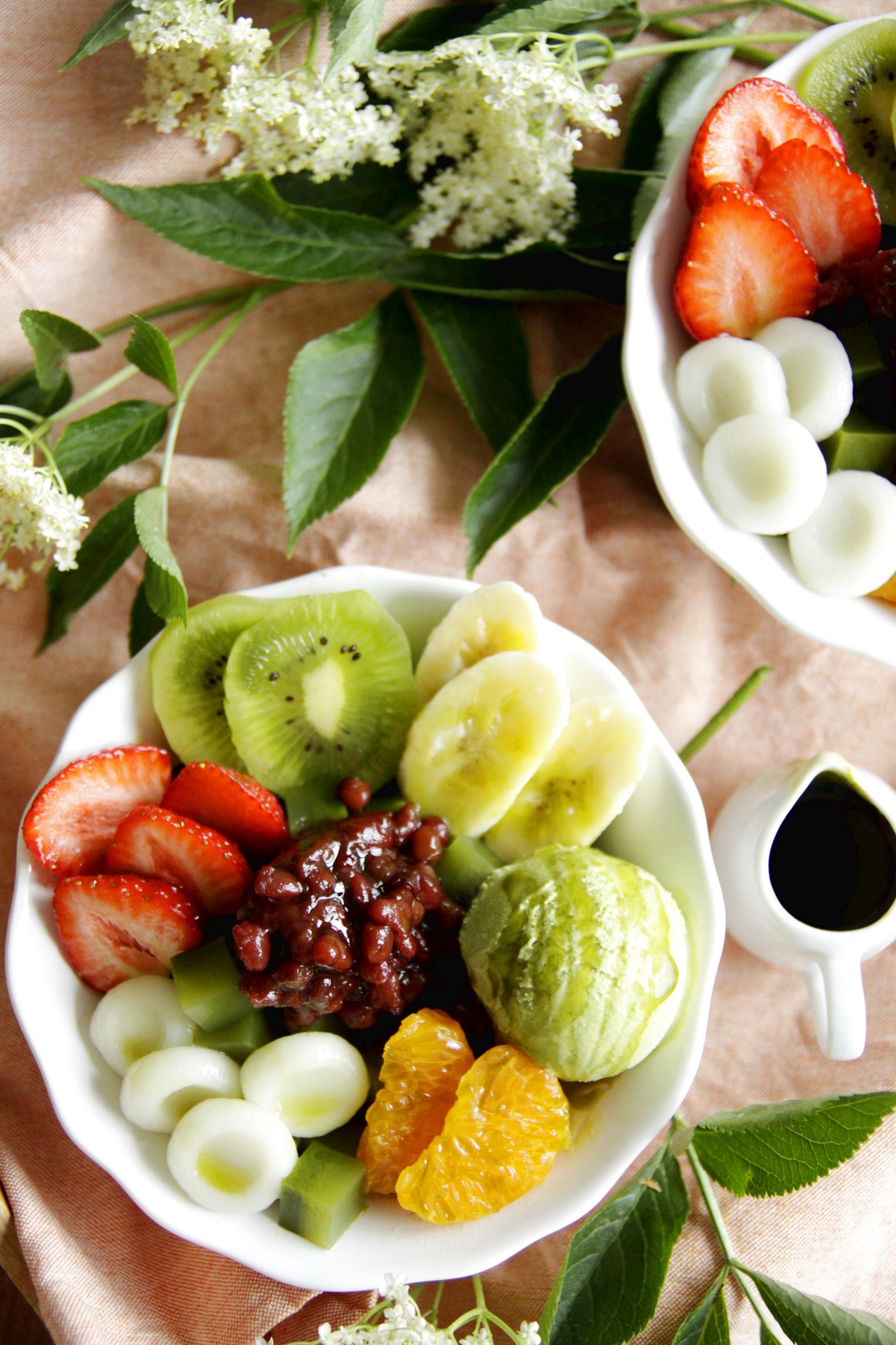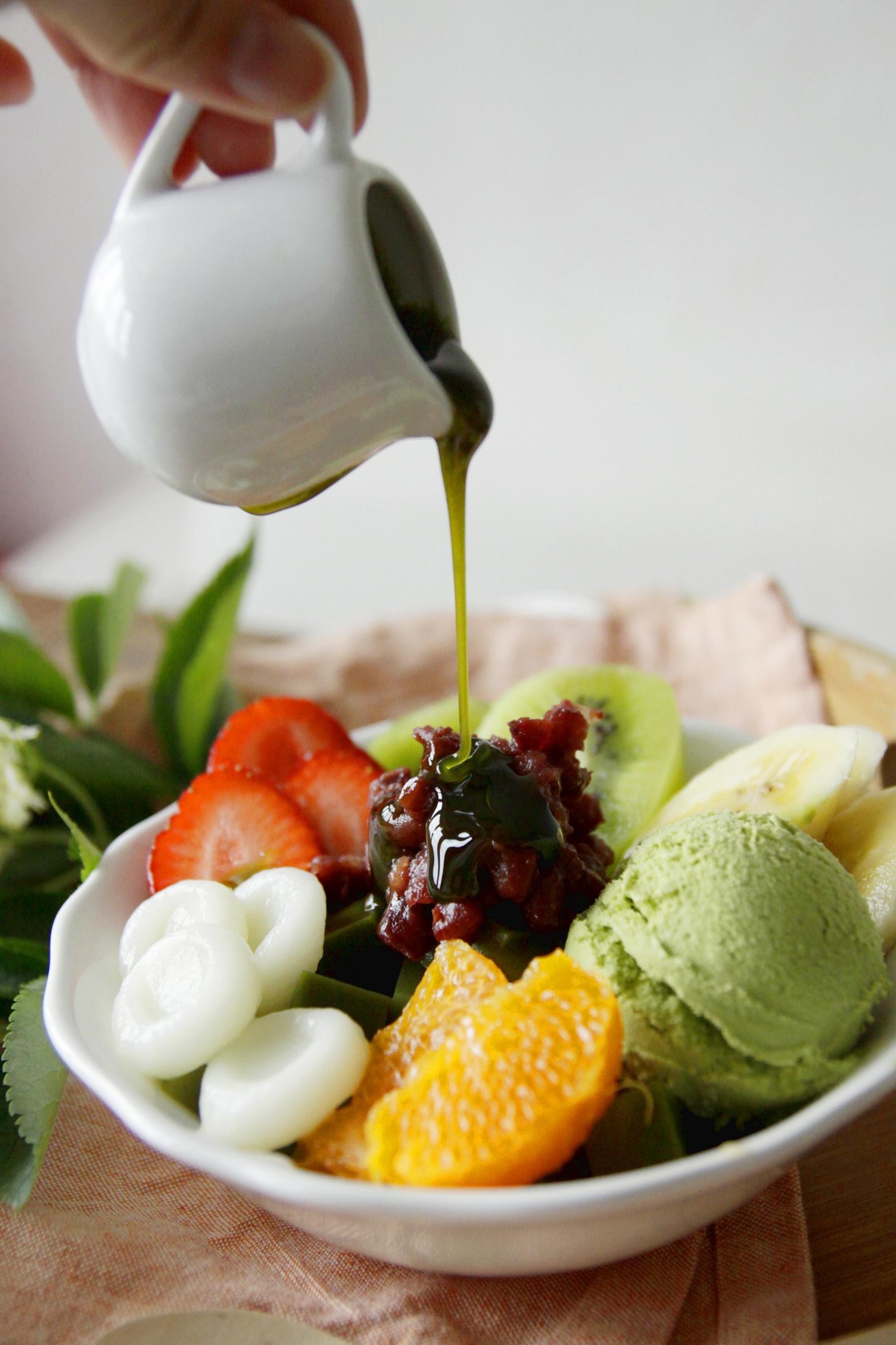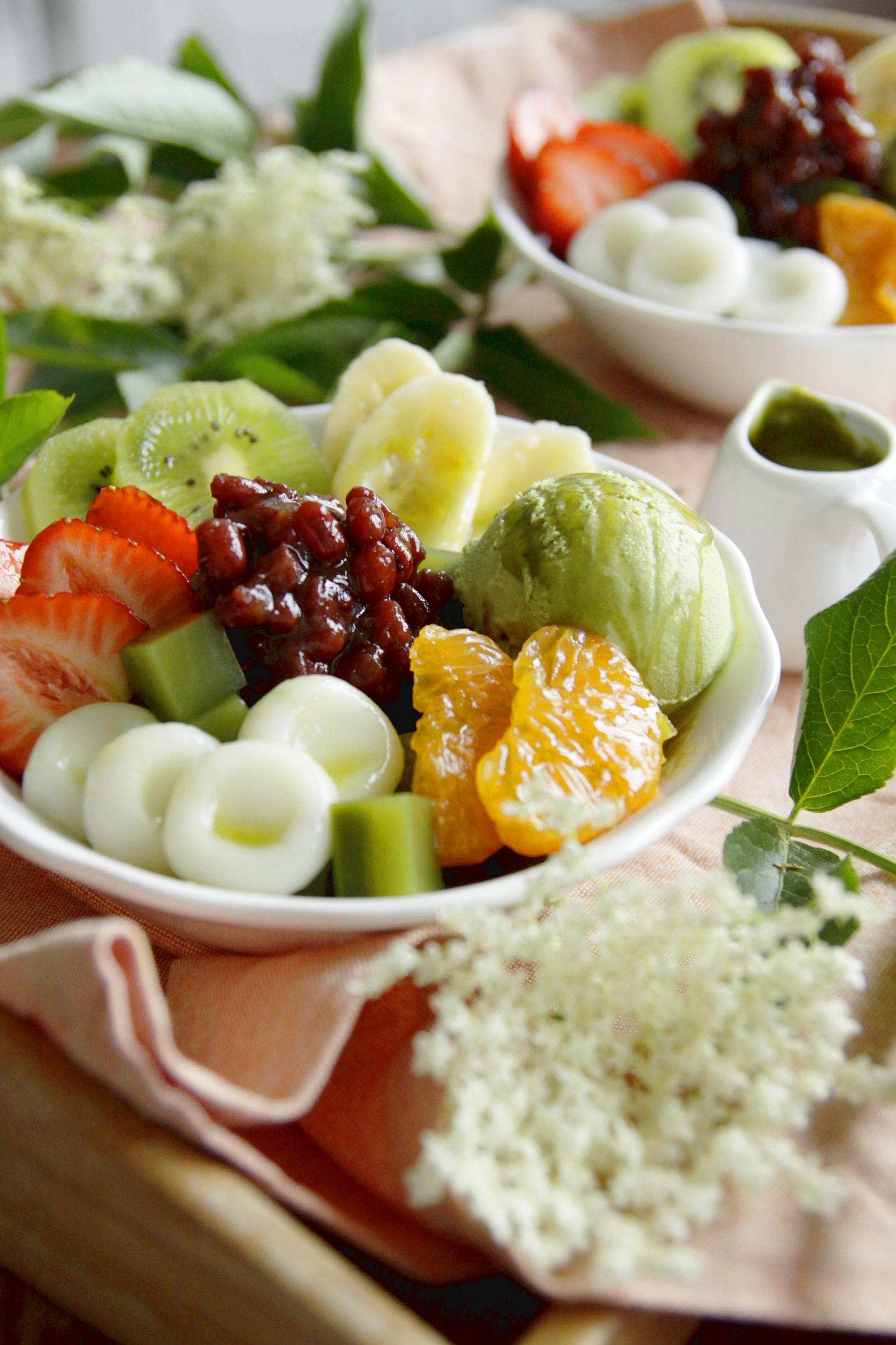Ăn kèm với hoa quả (dâu tây, chuối, kiwi, quýt), kem trà xanh và đậu đỏ hầm.