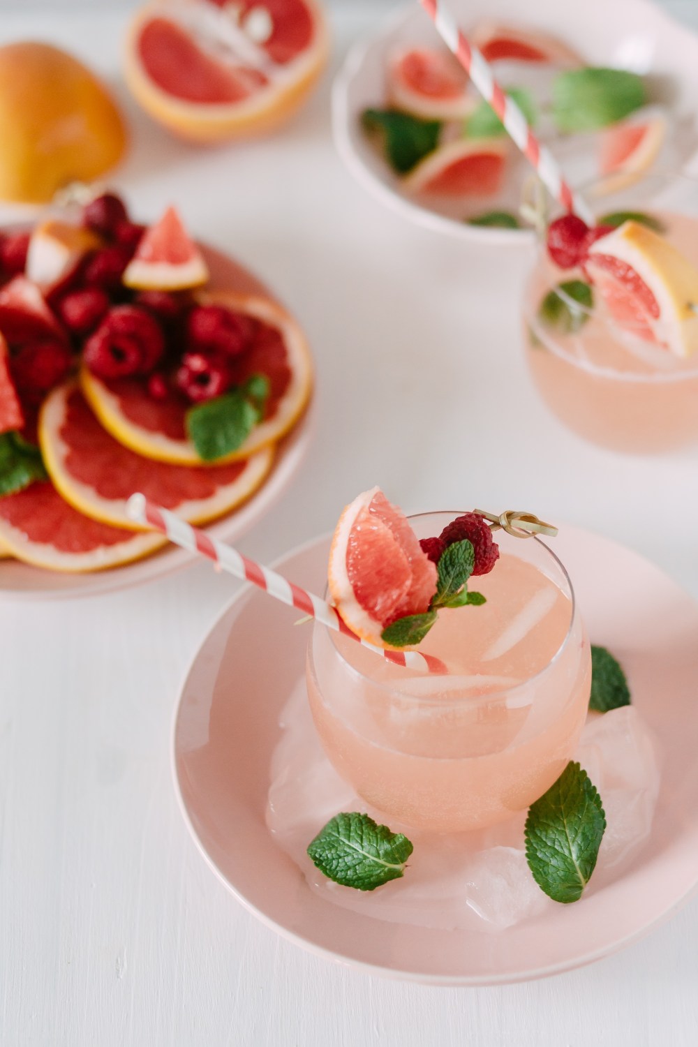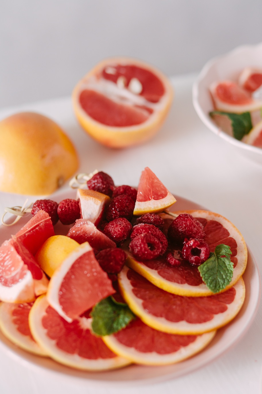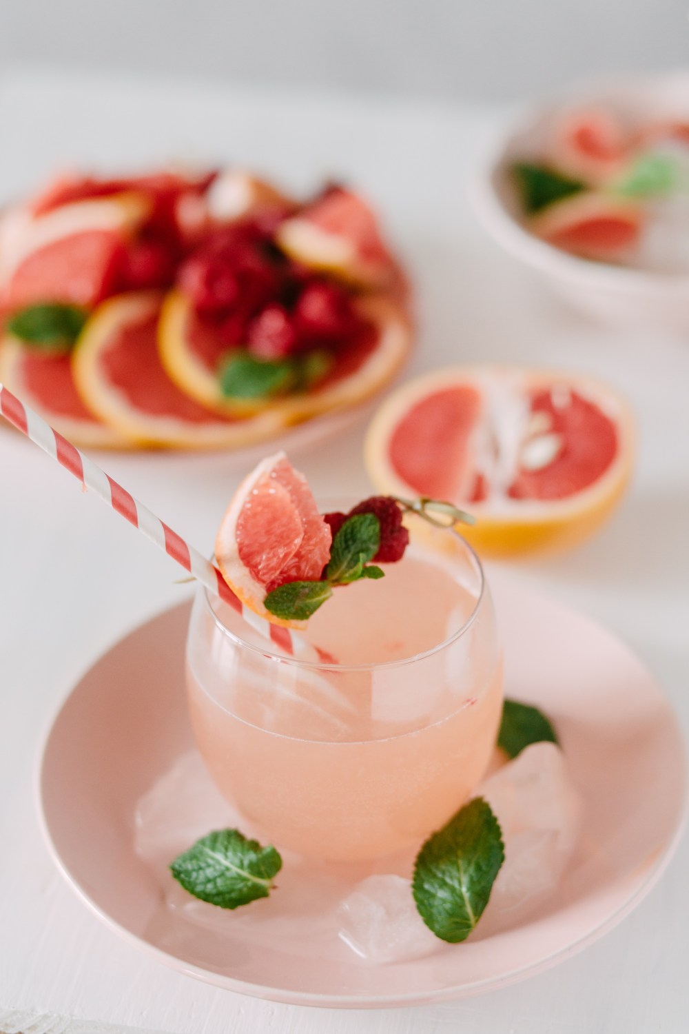 - Trang trí bằng xiên với mâm xôi, lá bạc hà và 1 miếng bưởi.