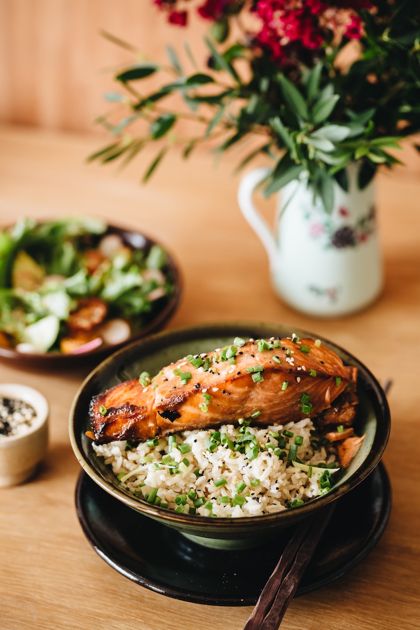Cá hồi thì ăn sống cũng ngon rồi nên mình hay nướng vừa chín tới thôi, bên ngoài đã xém vàng, mùi miso thơm lừng, bên trong vẫn mềm và mọng nước. Thế nên mọi người chú ý cá hồi không nên nướng lâu nói chung vì cá sẽ bị khô, xác, và trong món này nói riêng, vì miso rất nhanh cháy. Dạo này nhà mình chăm ăn cơm gạo lứt và mình thấy món cá này ăn rất hợp với gạo lứt, hoặc có thể trộn gạo lứt (đã ngâm) với gạo hạt tròn của Nhật cũng khá ngon.