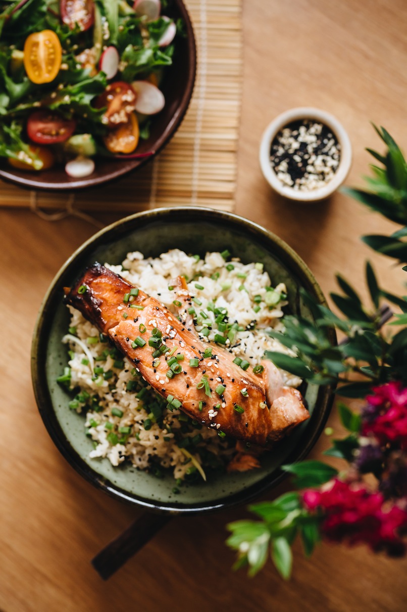 - Cá chín lấy ra đặt lên bát cơm gạo lứt, rắc thêm vừng rang và hành lá. Ăn nóng.