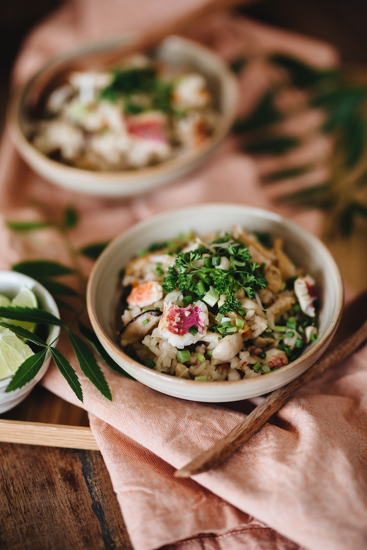 Món này tương tự như món cơm rang, hoàn toàn có thể là món vét tủ lạnh :)), nghĩa là ngoài gạo để nấu cơm là bắt buộc thì bạn có thể cho bất cứ nguyên liệu nào mà bạn thích vào.