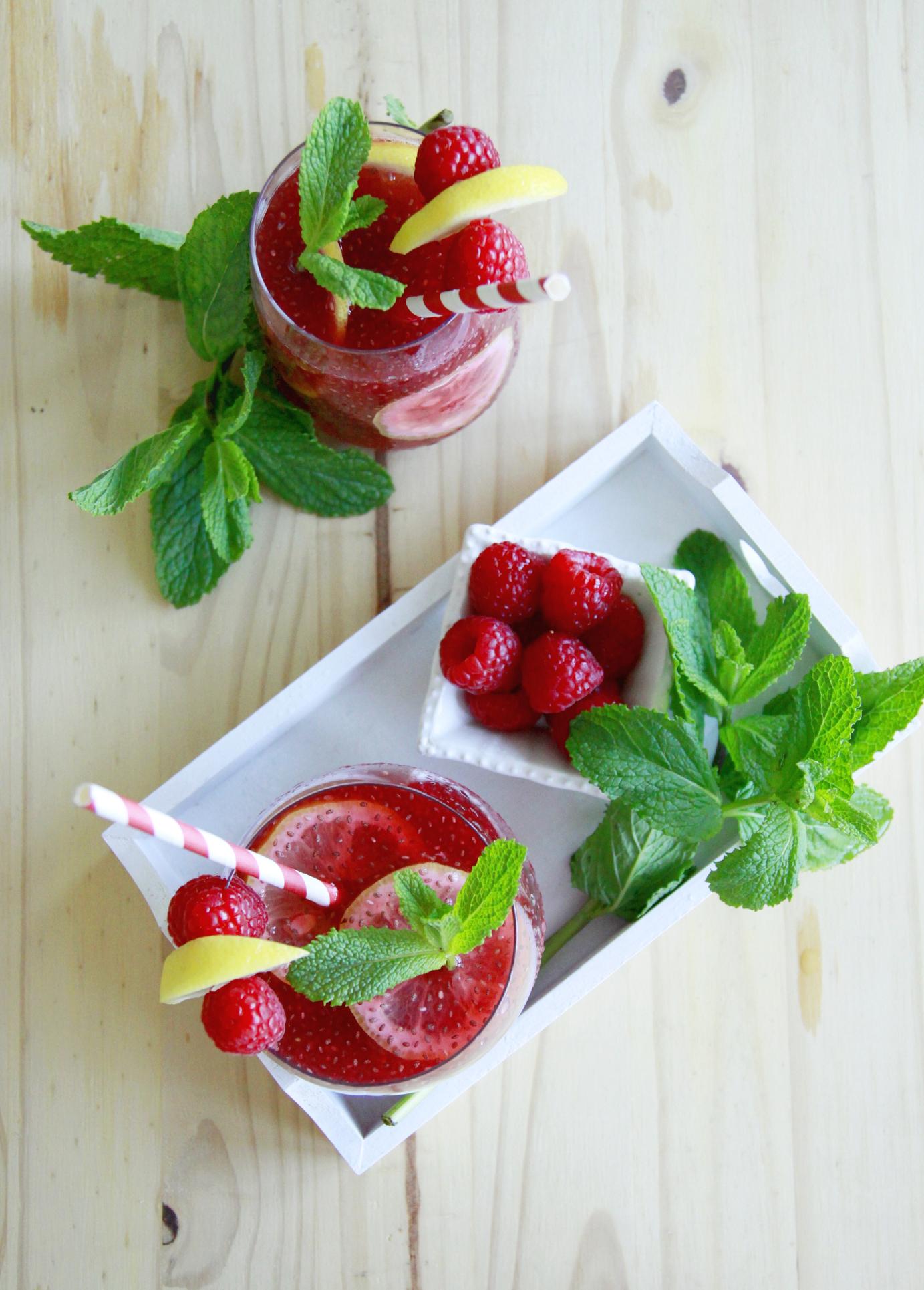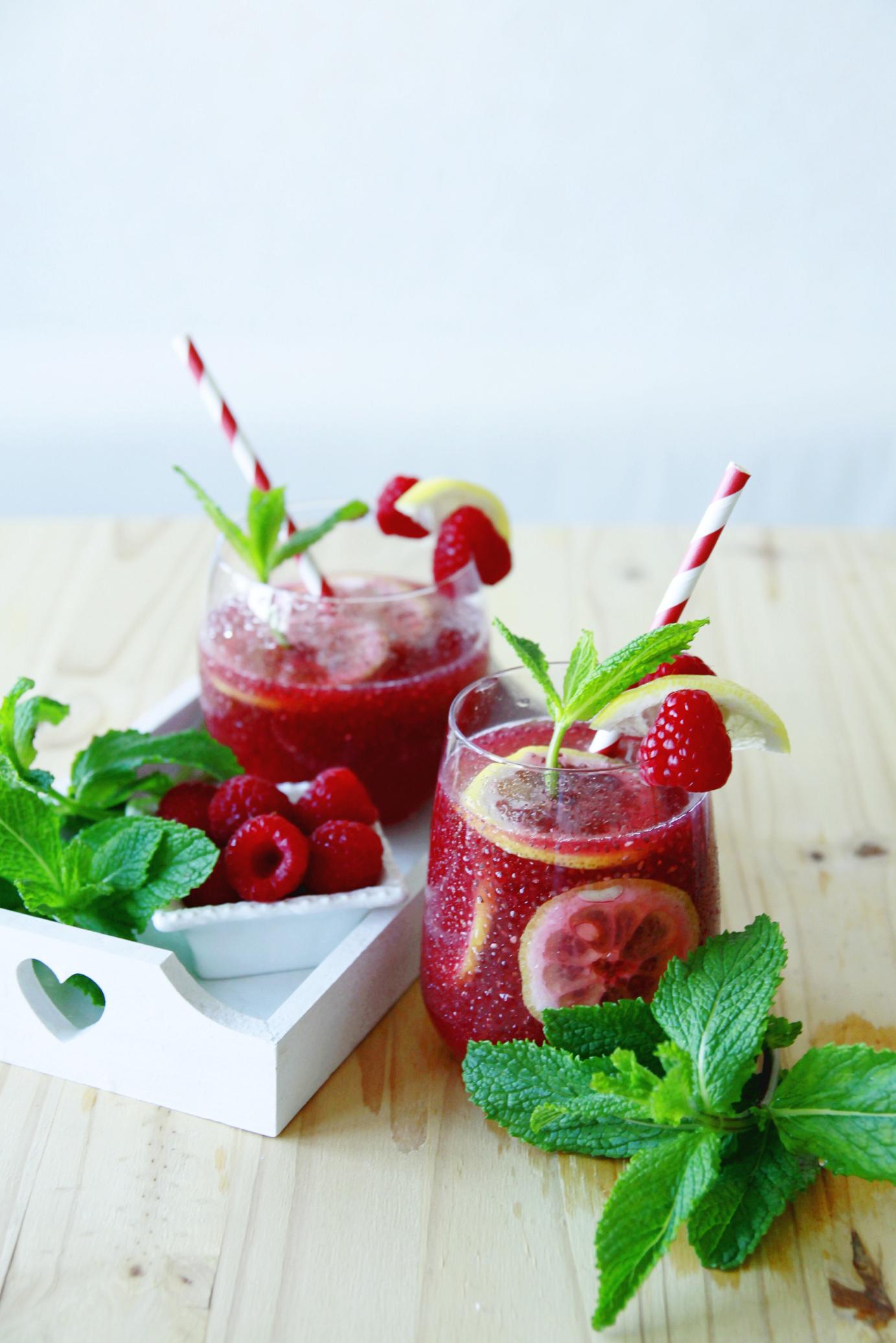 - Rót ra cốc với vài lát chanh và lá bạc hà. Trang trí cốc với lát chanh và quả mâm xôi.