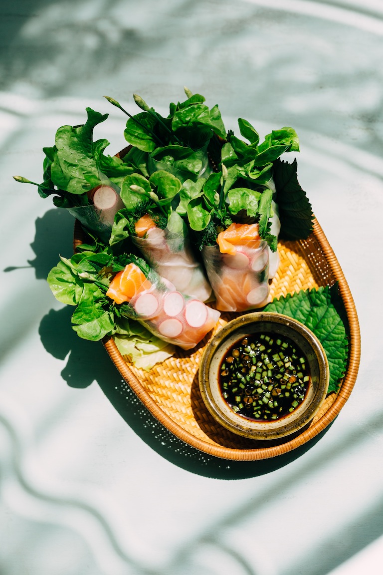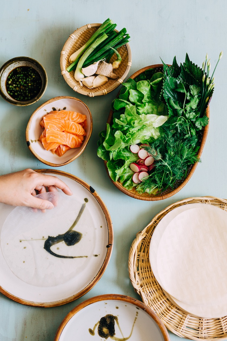 Món cá hồi cuốn rau hôm nay có chút hơi hướng của Nhật vì mình có dùng lá vừng và hoa hẹ trong rau cuốn, và nước sốt thì là xì dầu trộn với chút dầu vừng và dấm Nhật để có vị thơm thơm và chua nhẹ dễ ăn.