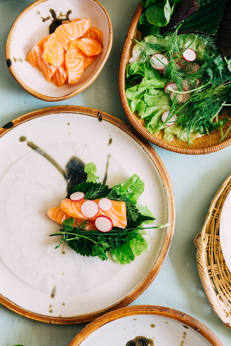 Mẹ mình thường nửa năm sống ở Việt Nam và nửa năm sống ở Na Uy, ở 1 ngôi làng nhỏ nằm giữa núi đồi đất nước Bắc Âu này. Ở đấy người ta có thể đang đi trên đường nhìn xuống hồ thấy có con cá ưng cái bụng thì lập tức vác cần ra câu về ăn. Nhiều nhất vẫn là cá hồi và cá hồi sông (trout – loài cá nhỏ hơn cá hồi thường, có màu ánh bạc và chấm vàng, nâu đỏ siêu đẹp và thịt chắc, ngon ngọt hơn cá hồi rất rất nhiều), chưa bàn đến thịt cá hồi sông tự câu trong thiên nhiên, thịt cá hồi loại to bán trong siêu thị ở Na Uy đã ngon ăn đứt các loại mình đã từng ăn rồi. Thịt cá chắc, vân mỡ đều nhưng không bị quá dày như cá nuôi công nghiệp, màu sắc đẹp, cắn vào thậm chí còn có độ giòn giòn. Nói chung là mình mê mẩn cá hồi mẹ mang về từ Na Uy cho mình. Và lần nào mình cũng ăn cá sống luôn để cảm nhận hết vị ngon của cá, từ cá sống cắt ra chấm xì dầu kiểu sashimi, cho đến trộn vào tô salad, hoặc làm món cuốn như món cá hồi cuốn rau này. Thế nên mọi người hãy tìm loại cá hồi tươi ngon nhất để có món cuốn nhiều huwong vị nhất nhé!