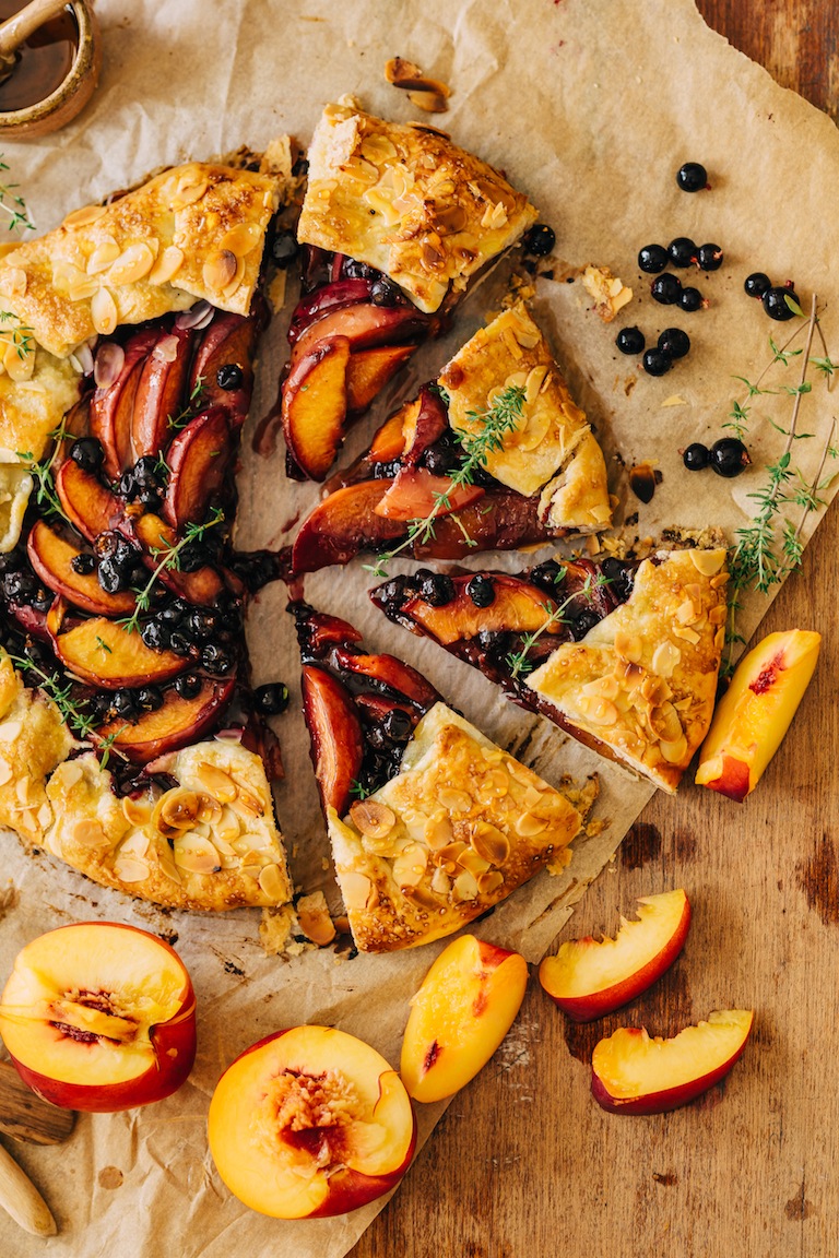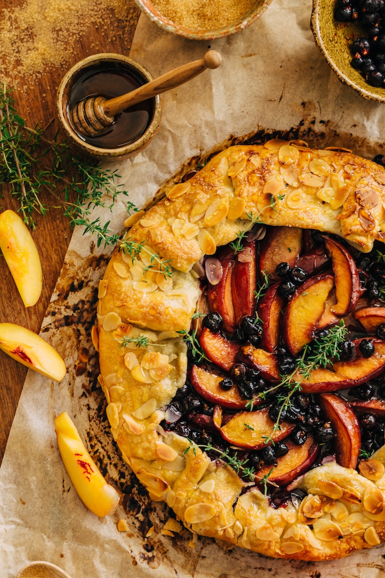 Như mình đã nói ở trên là bạn có thể kết hợp bất cứ các loại hoa quả nào mà bạn thích, như ở đây mình dùng đào vàng và quả việt quất vì mình thấy 2 màu vàng tươi của đào tương phản với nước màu tím đỏ ứa ra từ quả việt quất rất đẹp. Chỉ có 1 lưu ý nho nhỏ là trong công thức bạn thấy mình có cho thêm 1 thìa bột ngô vào trộn với phần nhân hoa quả. Đó là bởi vì việt quất nói chung, và nhất là loại việt quất dại quả tròn nhỏ này, khi mình đem nướng hay nấu chín thì tiết ra khá nhiều nước, nên để tránh cho phần nước này làm ỉu đế bánh, bột ngô sẽ có tác dụng làm sánh phần nước đó lại, cũng khiến cho các nguyên liệu trong nhân quện với nhau hơn, vừa dễ ăn hơn và tạo thẩm mỹ xinh đẹp cho chiếc bánh hơn khi cắt bánh ra. Với các loại hoa quả khác thì tuỳ theo đó là loại quả nhiều nước như các múi cam, quýt, dâu tây… thì bạn nên cho thêm phần bột ngô như trong công thức này, còn lại thì bạn có thể bỏ qua nguyên liệu này nhé! 🙂