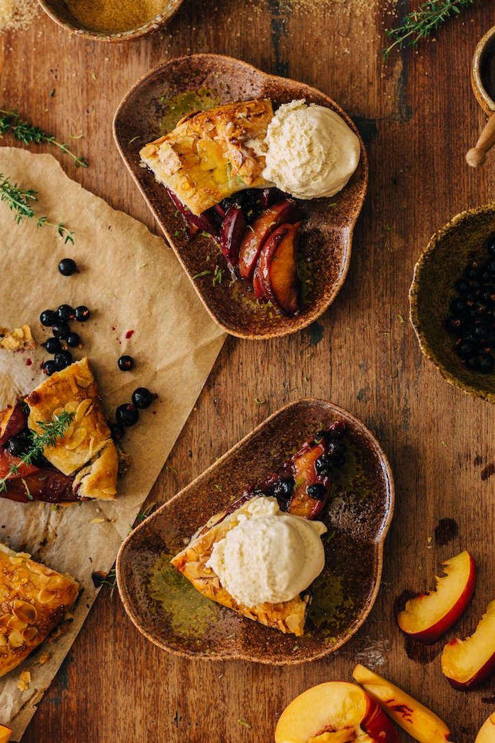 Cắt miếng bánh còn ấm nóng, múc thêm 1 viên kem vani ngọt ngào béo ngậy và pha thêm tách trà hoa thơm nhẹ nữa là bạn đã có 1 bữa tea time đầy hương vị của mùa thu rồi đấy! 🙂 Vị đào và việt quất chua chua, hoà quện với cái sánh mịn thơm ngọt của kem vani đang tan chảy dưới sức nóng của miếng bánh. 1 miếng bánh mà có đầy đủ cả ngọt và chua, cả nóng và lạnh, thú vị đấy chứ nhỉ? ^^