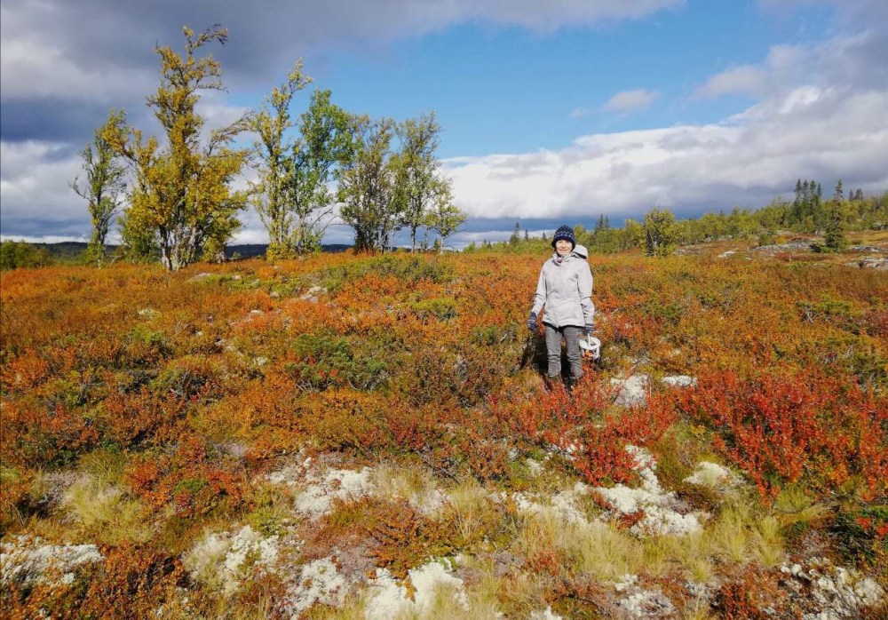 Ở post trước mình có kể với mọi người về loại cá hồi sông với thịt siêu ngon và ngọt vị mẹ mình câu ở Na Uy, thì chiếc bánh này cũng được làm từ quả việt quất dại mẹ mình hái ở đó. Mẹ và bác mình sẽ lái xe đến 1 điểm trong rừng, rồi sau đó còn phải đi bộ và leo vài tít trong núi khoảng 5-6km nữa. Ở đó là bạt ngàn các loại cây bụi thấp chỉ cao hơn cổ chân 1 chút, đó là các loại quả mọng (berry) dại thơm ngon tinh khiết nhất từ núi rừng và chứa vô cùng nhiều các chất chống ô xy hoá như việt quất (blueberry) hay các loại quá khác mà mình không biết tên tiếng Việt như cloudberry (mình sẽ có 1 bài post riêng về loại quả này), lingonberry… Như bạn thấy trong ảnh này là mẹ mình đang xách xô đi hái đó ^^.