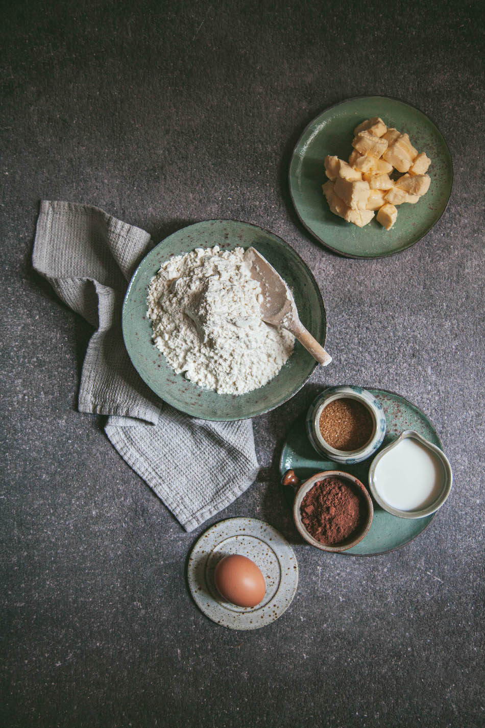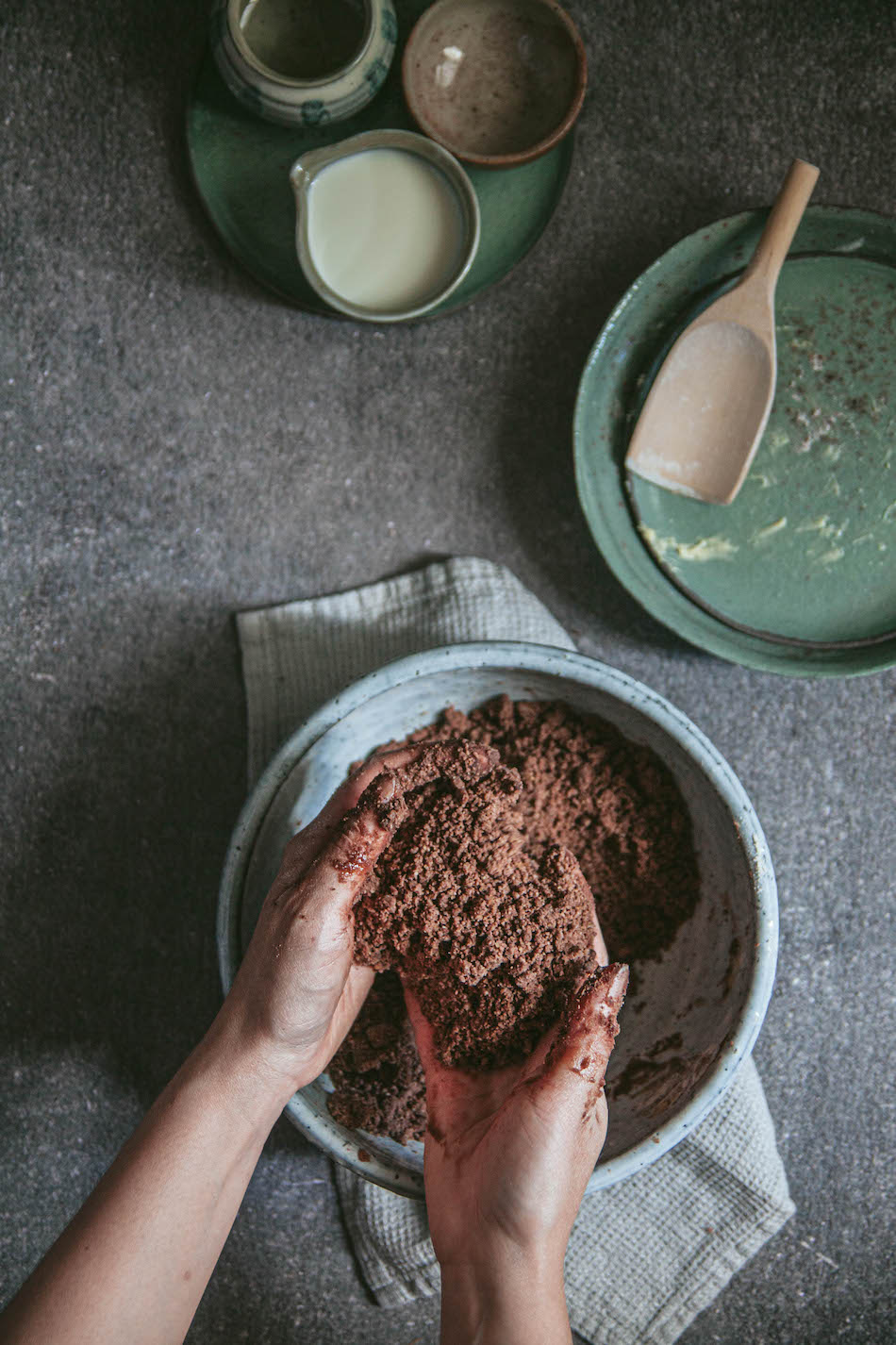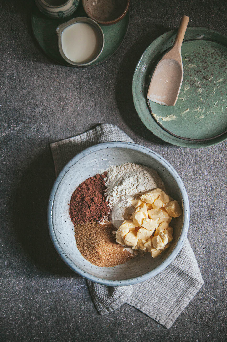 - Trong 1 cái thố trộn to, cho vào bột mỳ, bột cacao, đường, muối và bơ rồi trộn đều nhanh tay. Bước này mình cần làm nhanh 1 chút vì hơi nóng từ tay mình có thể làm chảy bơ.