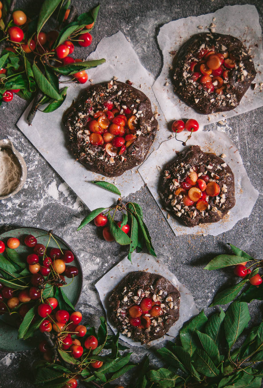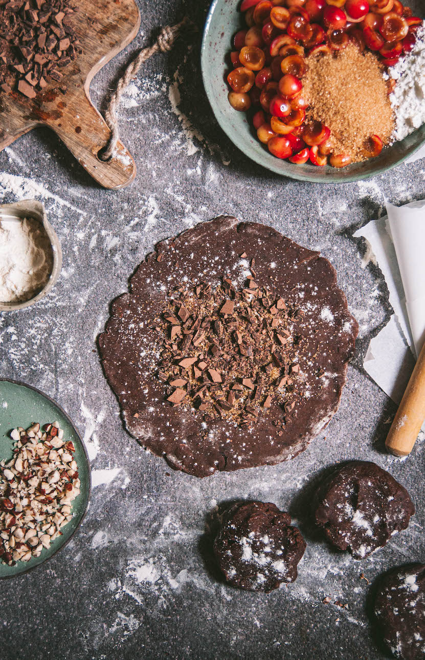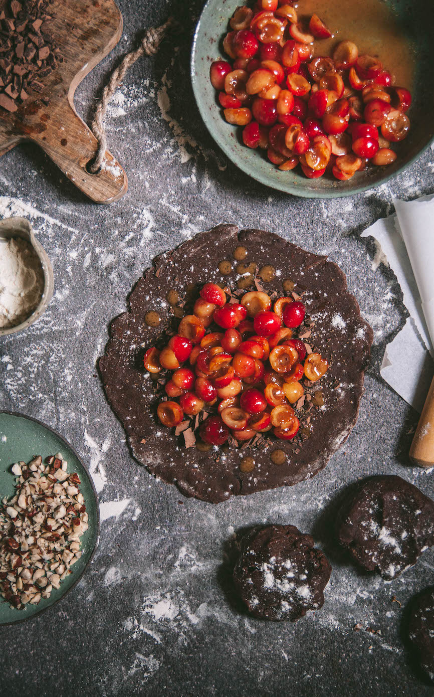 - Xúc anh đào lên mặt miếng bột bánh, gấp mép bột lại rồi ấn nhẹ cho bột giữ nếp cố định lại.