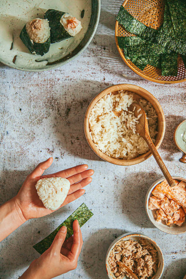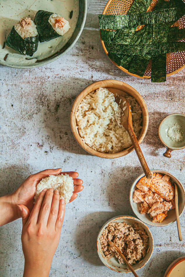 - Xúc 1 thìa cơm vào lòng bàn tay, ấn nhẹ ở giữa để tạo thành chỗ xếp nhân. Cho nhân cá và rồi nắm lại, dùng các ngón tay và lòng bàn tay của 1 tay tạo thành góc tam giác, lòng bàn tay của tay còn lại làm cạnh thứ ba của tam giác. Nắm cơm chặt lại và tạo hình cho đến khi có nắm cơm hình tam giác hoàn chỉnh. Cơm được nắm chặt vừa phải thành khối, không bị rời hay vỡ ra.