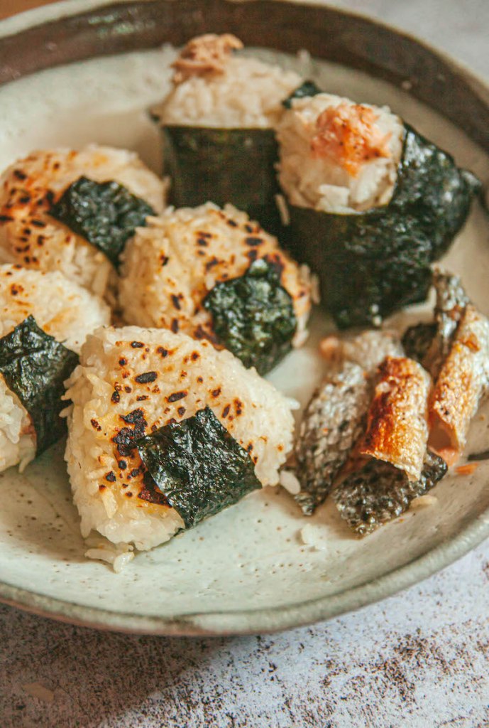 - Cuốn nắm cơm bằng lá rong biển rồi xúc một chút xíu nhân đặt lên trên để phân biệt các loại khác nhau. Mình có làm thêm 1 loại khác là nướng nắm cơm trên chảo gang nóng có xoa chút dầu, tạo thành lớp cơm cháy bên ngoài nắm cơm cũng rất hấp dẫn.