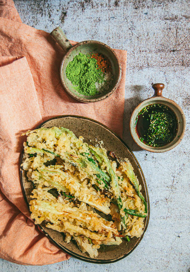 Sốt chấm xì dầu có pha thêm chút chanh hoặc dấm sẽ có vị chua ngọt dịu nhẹ rất dễ chịu, còn muối matcha lại có chút vị đắng của matcha và cay cay của ớt, giúp cân bằng lại vị béo ngậy của món chiên.