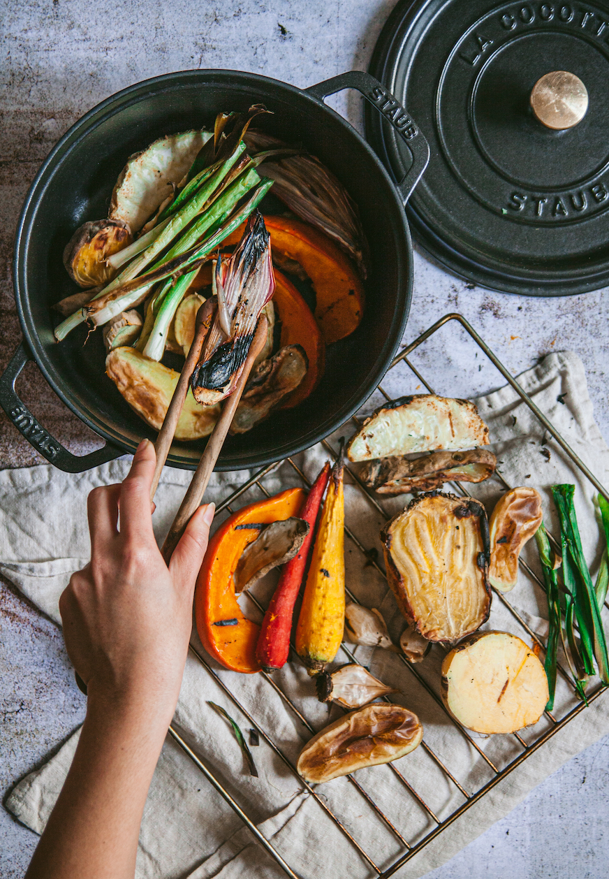 Cũng như làm nước dùng rau củ, mình dùng toàn những nguyên liệu có sẵn và rất nhiều loại củ vì đang là mùa đông nên mình không có nhiều các loại rau lá để ăn kèm với mỳ. Nhưng nếu nơi bạn sống không tìm được những loại rau củ giống mình thì bạn hoàn toàn có thể thay thế bằng các loại rau củ mà bạn thích và dễ dàng mua được như các loại nấm (nấm hương, nấm bào ngư, nấm đùi gà…), đậu phụ (tươi hoặc chiên), ngô bao tử, bông cái xanh, đậu cô ve, cải đắng, cải bẹ, bắp cải, cải thảo… Nếu dùng nhiều các loại rau lá thì bạn nên hấp, xào sơ hoặc trần luôn trong nồi nước dùng thì sẽ ngon hơn, còn với các loại củ thì bạn nên nướng như mình làm nhé!