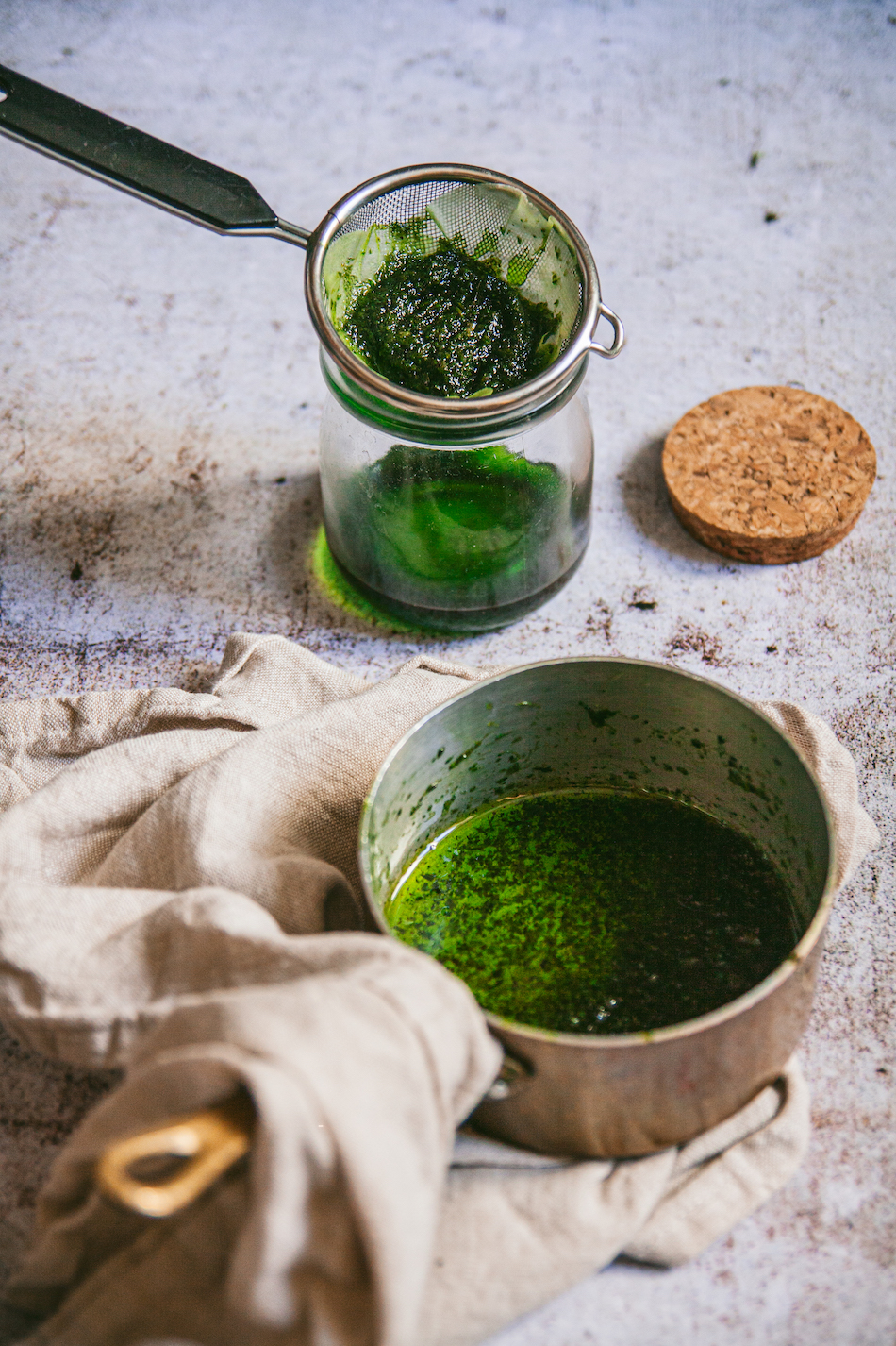 Đây là cách mình hay dùng để giải quyết các loại rau thơm thừa trong tủ lạnh như rau mùi, hành lá, lá xô thơm, rau húng quế… Các loại rau thơm có lá mỏng như thế thường hay héo khá nhanh, mà nhiều khi người ta bán cả bó to còn mình chỉ cần dùng vài lá, thì mình sẽ đem đi làm dầu thảo mộc kiểu này. Dầu thảo mộc rất thơm, có màu xanh của các loại lá thơm rất đẹp, và cũng dễ dùng vì mình cho vào đâu cũng được: trộn salad thay dầu ô liu này, trộn một chút với phần sốt cho các món mỳ, cho vào các loại sốt như mayonnaise, các loại súp hoặc purée (rau củ nghiền) để thêm hương vị, hay cho 1 thìa nhỏ vào mỗi bát khi nấu các món nước như trong món mỳ udon này… Dầu sẽ bám vào các sợi miến, mỳ hay các lá rau và làm tăng thêm hương vị cho món ăn.