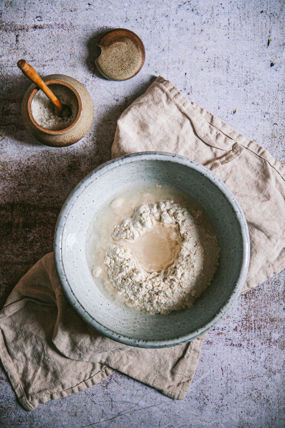 - Đổ bột, muối vào tô trộn. Trộn đều rồi thêm nước vào tô.