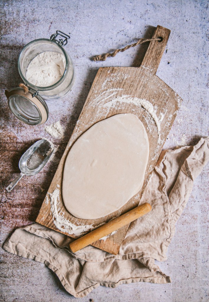 - Sau 1h, xoa một chút bột mỳ lên bề mặt và cây cán bột, rồi cán khối bột cho đến khi thành miếng dày 0,5cm.
