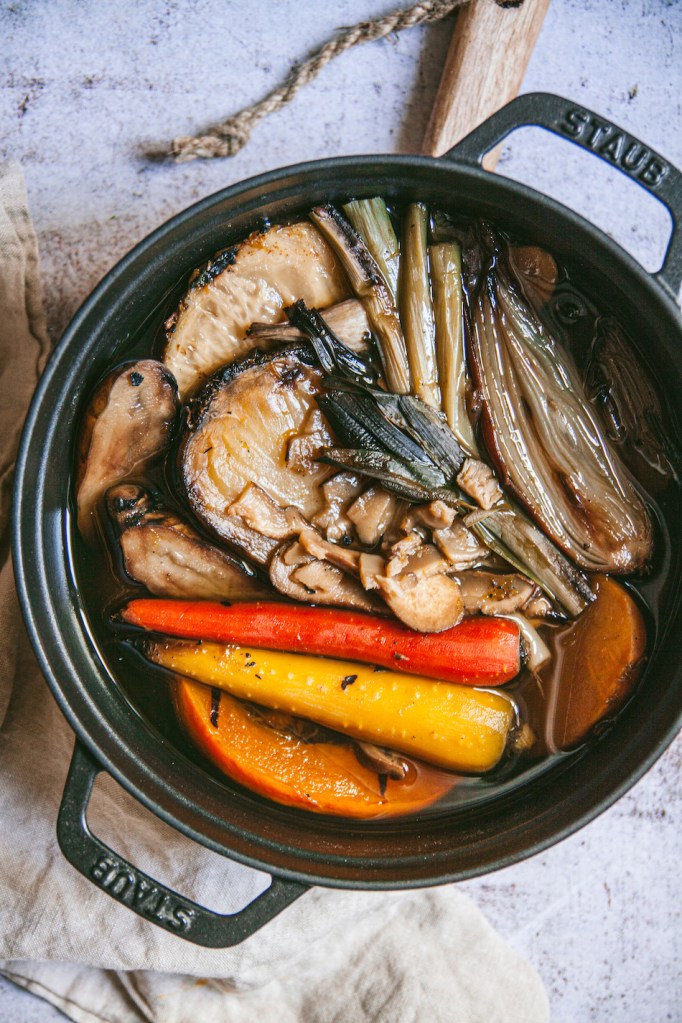 Sau khi hầm nhỏ lửa 1h, các loại rau củ tiết ra vị ngọt lịm, mình có một nồi nước dùng vô cùng tròn vị và đậm đà. Nước dùng rau củ này có thể dùng như các loại nước dùng bình thường để nấu các loại súp, các món nước như miến, mỳ, phở chay…, hay các món cơm cá rau củ và cơm cá thu măng nấm….
