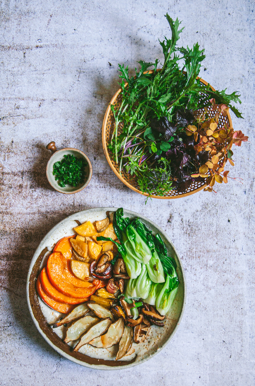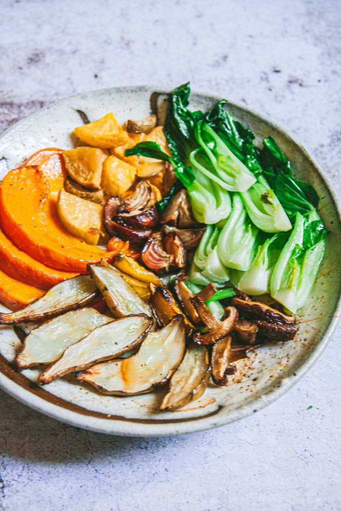 - Chuẩn bị các loại rau củ nướng ăn kèm với mỳ: các loại rau củ rửa sạch hết đất, thái lát dày khoảng 1cm hoặc các củ nhỏ thì cắt làm đôi. Nấm shiitale thái lát. Trộn đều tất cả với một thìa dầu ô liu và muối rồi đem nướng ở nhiệt độ 180 độ C trong khoảng 20-25′ cho đến khi rau củ chín mềm. Trong khi chờ rau củ chín thì chuẩn bị các nguyên liệu khác và nước dùng.