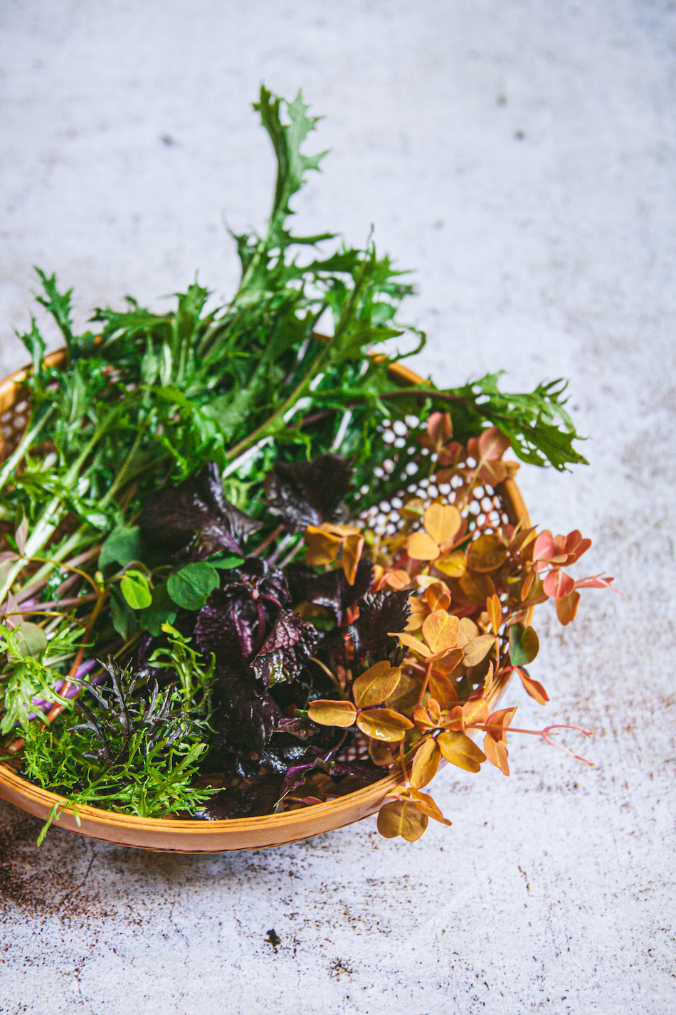 - 1 vài loại rau salad/rau thơm ăn kèm: ngọn tía tô, ngọn cải mù tạt, lá me đất…