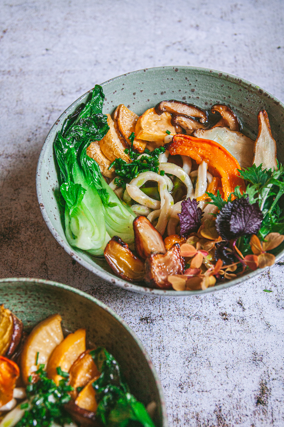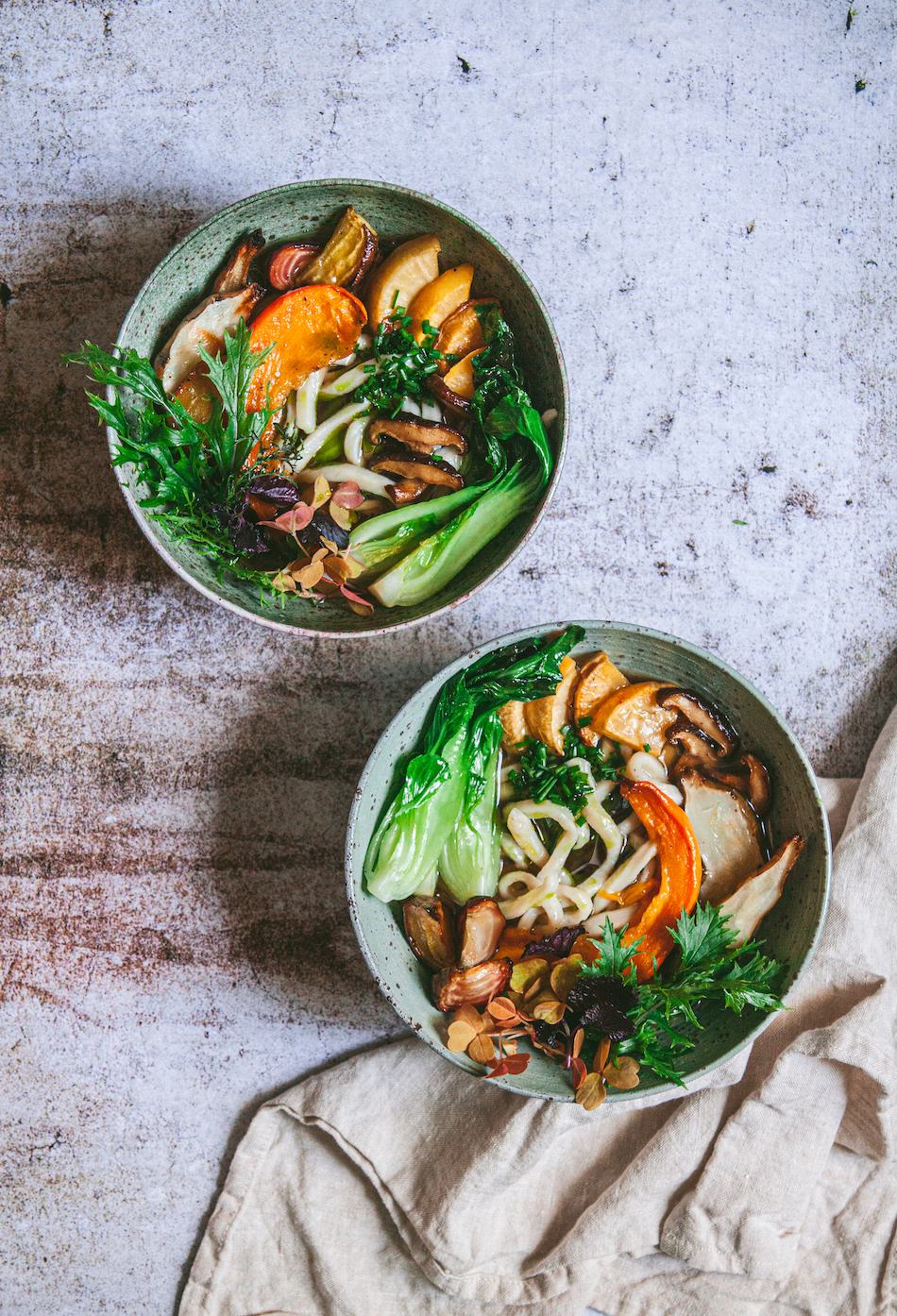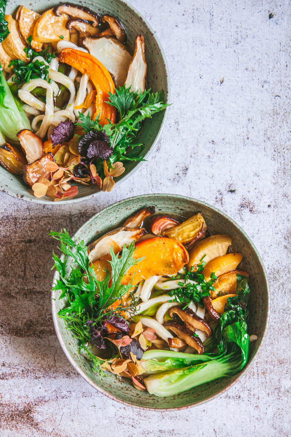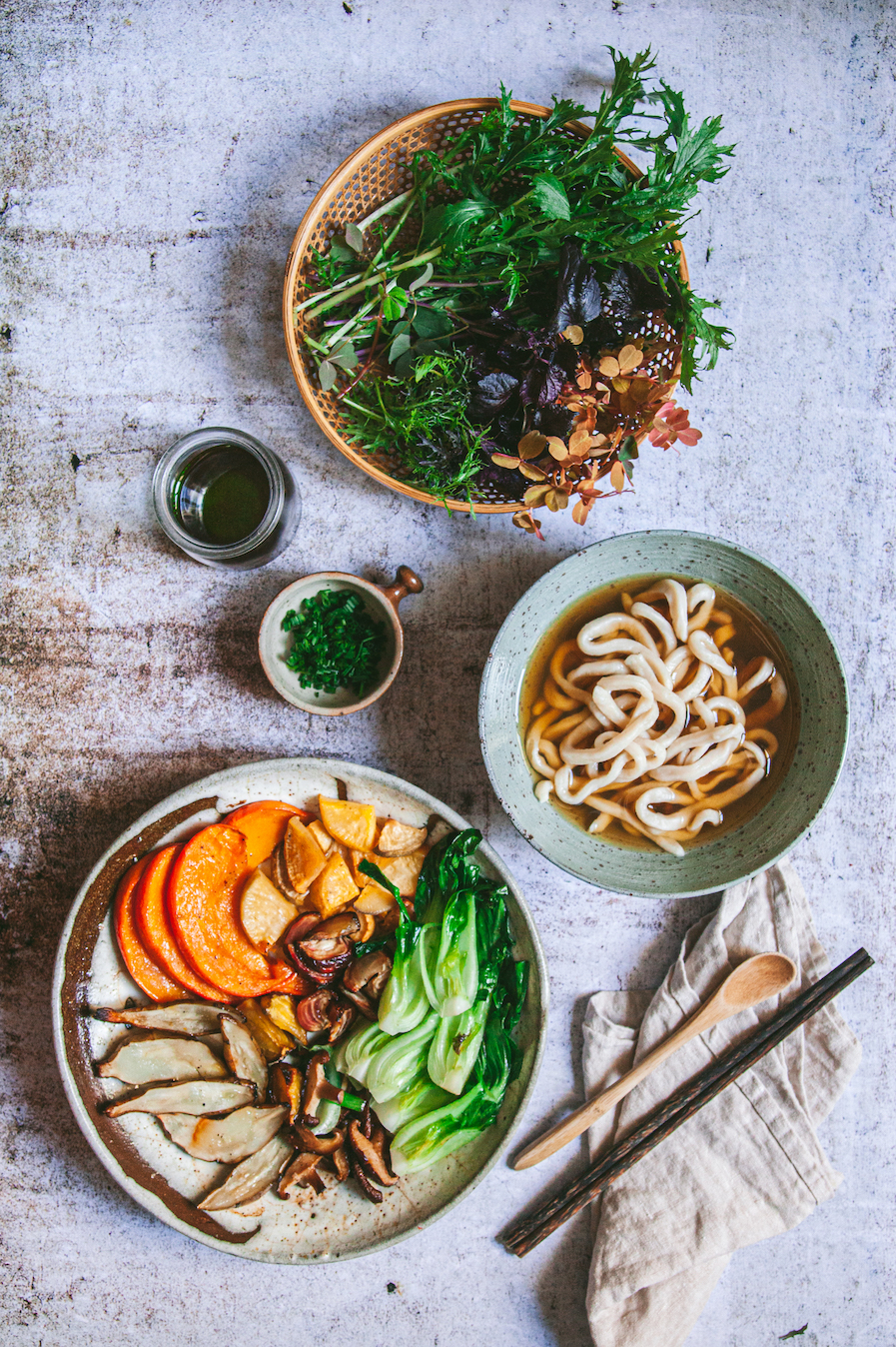 Vốn có 1 vài công thức mùa thu muốn chia sẻ với mọi người, nhưng mà quay đi ngoảnh lại cái đã đến mùa đông. Suy nghĩ mãi cuối cùng mình chọn món ăn nhiều màu sắc và hương vị tuy tròn trịa nhưng lại rất thanh nhẹ này, để bắt đầu một năm mới viết blog mới. Hơn nữa sau dịp lễ Noel và cuối năm mình đã chén không biết bao nhiêu là đồ ăn béo và nhiều chất như gan ngỗng, gà nướng, phô mai…, thì món mỳ udon chay nhẹ nhàng và bổ sung nhiều vitamin với chất xơ thế này là món vô cùng thích hợp luôn ấy! 🙂