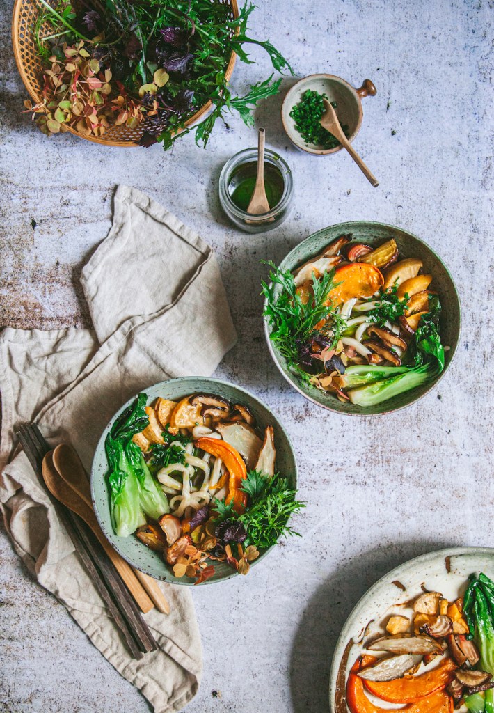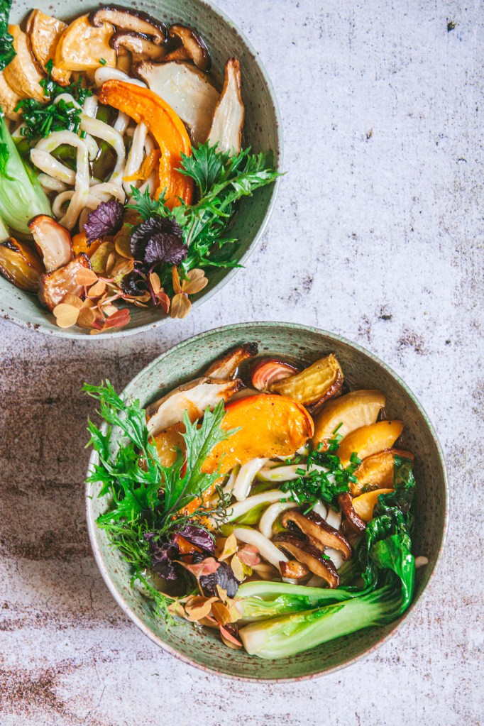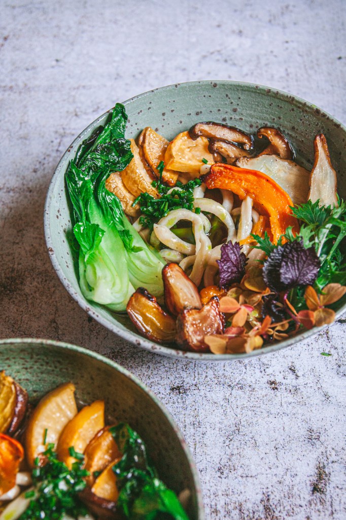 - Xếp sợi mỳ udon vào bát. Lần lượt xếp các loại rau củ nướng và các loại rau thơm lên trên, rắc chút hành lá.