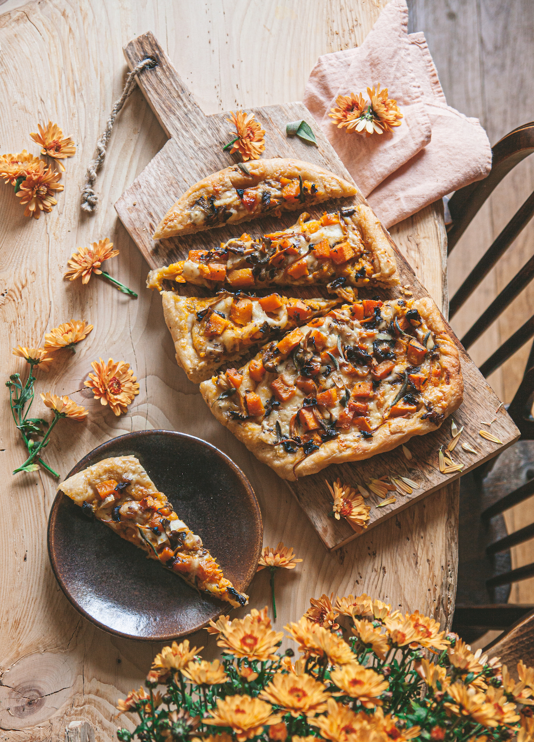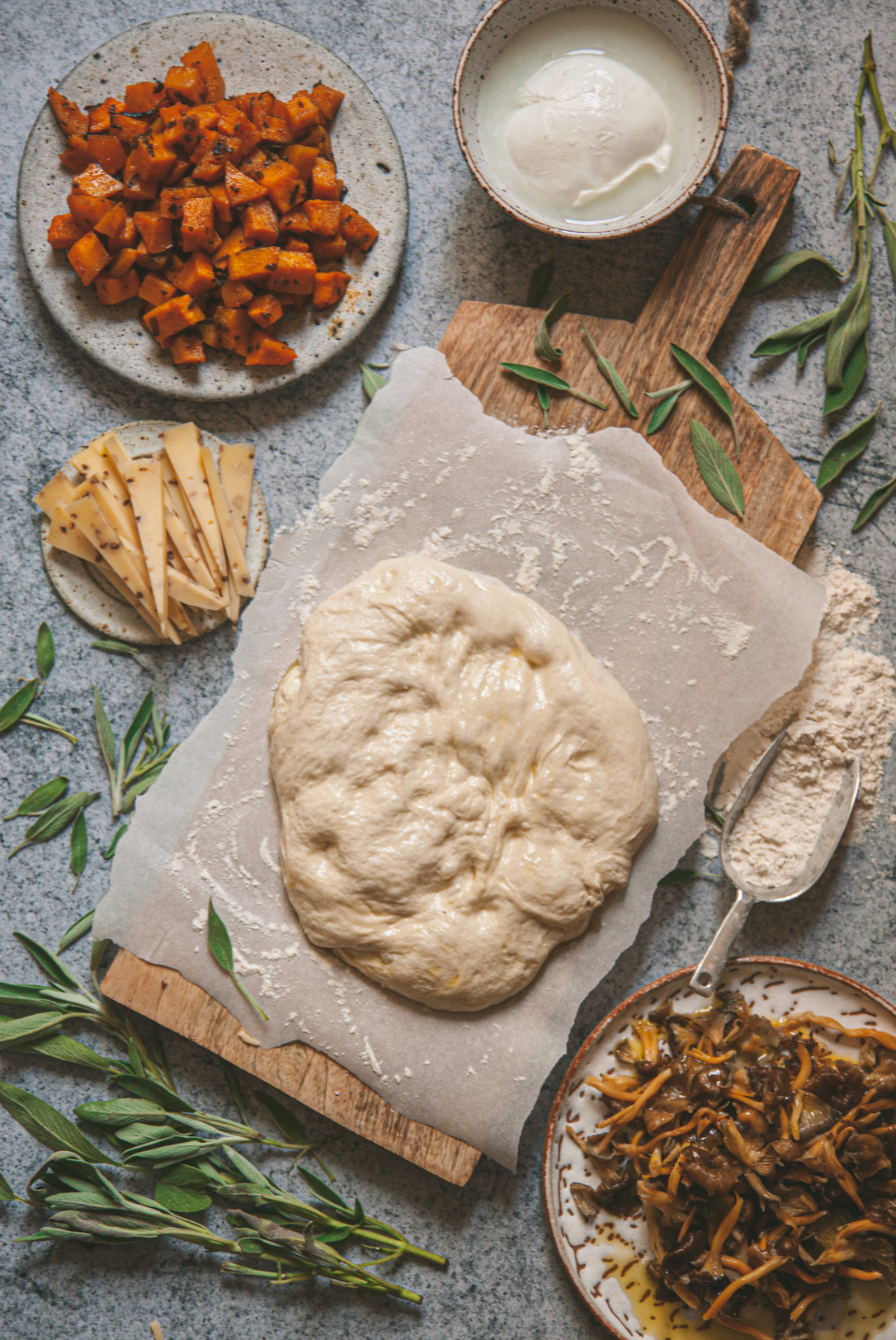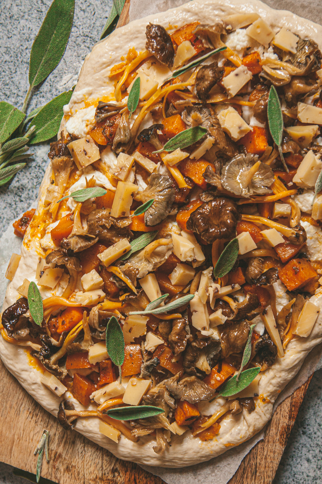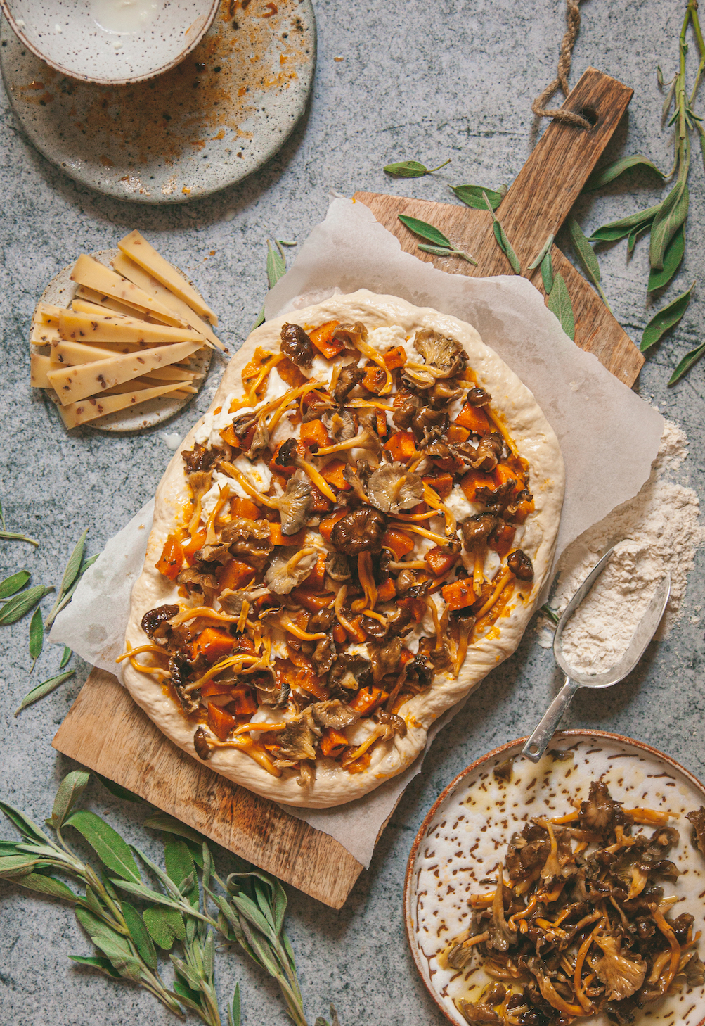 Nhìn thấy hai loại nguyên liệu này là thấy cả mùa thu rồi ấy nhỉ? ^^ Thế là mình có ý tưởng làm ngay một chiếc bánh pizza với nấm và bí đỏ. Thay vì dùng sốt cà chua như các loại bánh pizza thông thường thì mình dùng bí đỏ nghiền thành sốt. Món bánh pizza này cũng phù hợp với các bạn ăn chay có trứng và sữa vì mình chỉ dùng rau củ và bơ, phô mai.