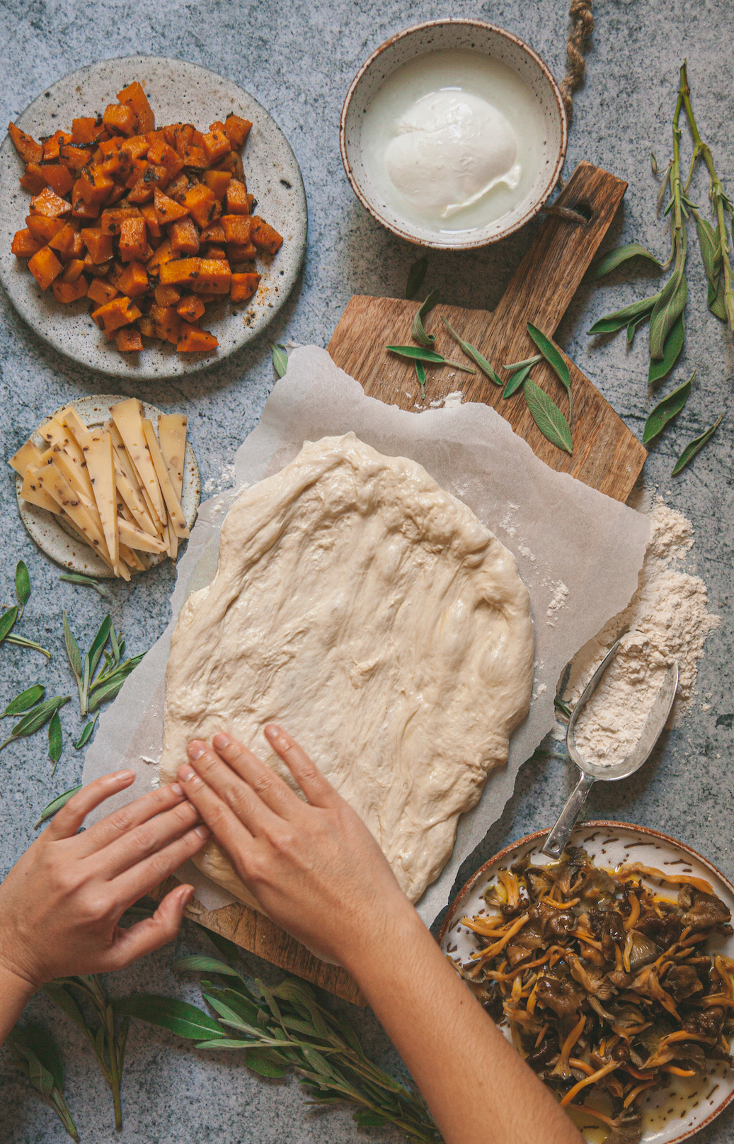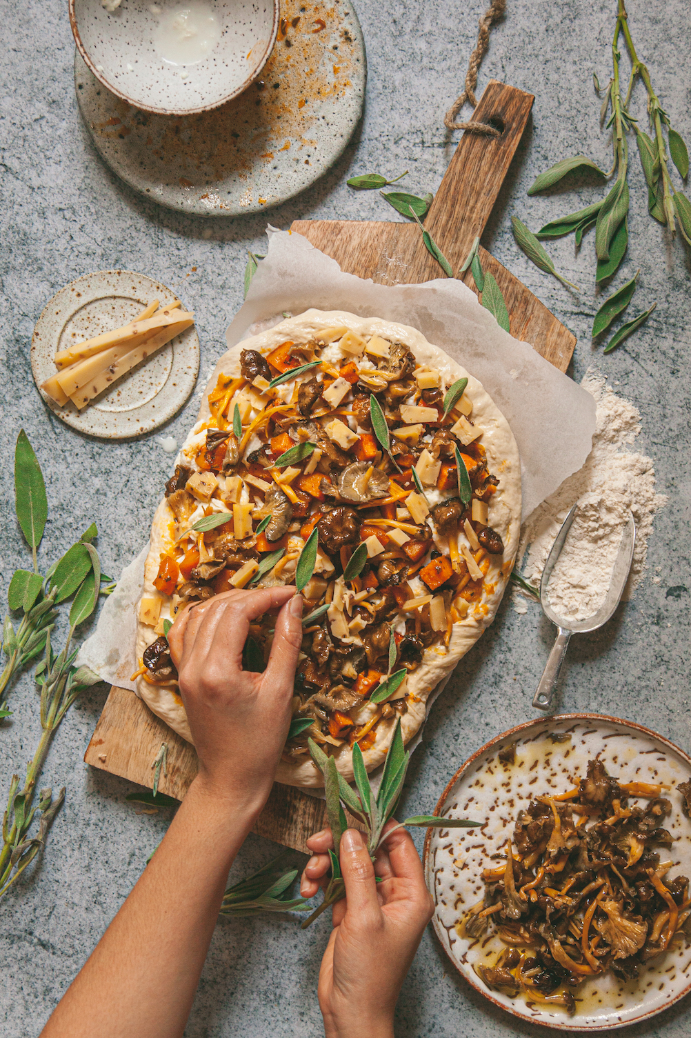 - Nhấc miếng bột lên khay nướng rồi dàn đều. Phết phần sốt bí đỏ đều lên mặt bột, chừa lại 2cm mép bột. Tiếp theo xếp lần lượt phô mai mozzarella, các miếng bí đỏ nướng, nấm trộn hành tây xào, và cuối cùng là rải đều phô mai fontina cùng với lá xô thơm lên mặt bánh.