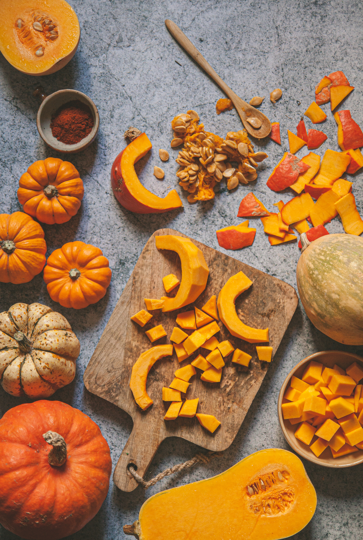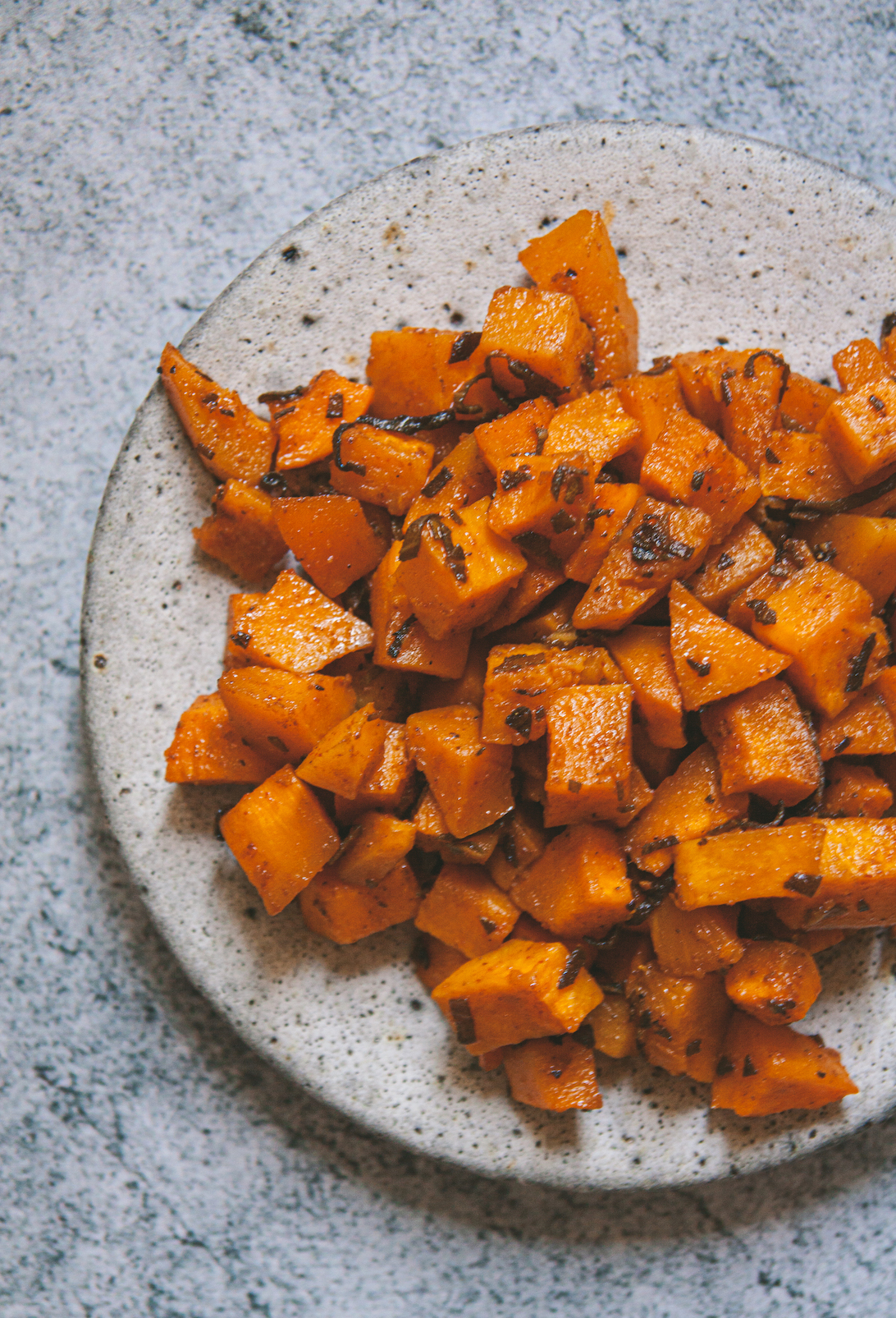 - Bí đỏ gọt vỏ, bỏ ruột rồi thái miếng vuông nhỏ (cỡ 1,5×1,5 cm). Cho bí vào khay nướng cùng với 2 thìa súp dầu ô liu, mật ong, 1 thìa súp (4-5 lá) xô thơm thái nhỏ, bột quế, bột ớt cùng với muối và hạt tiêu.